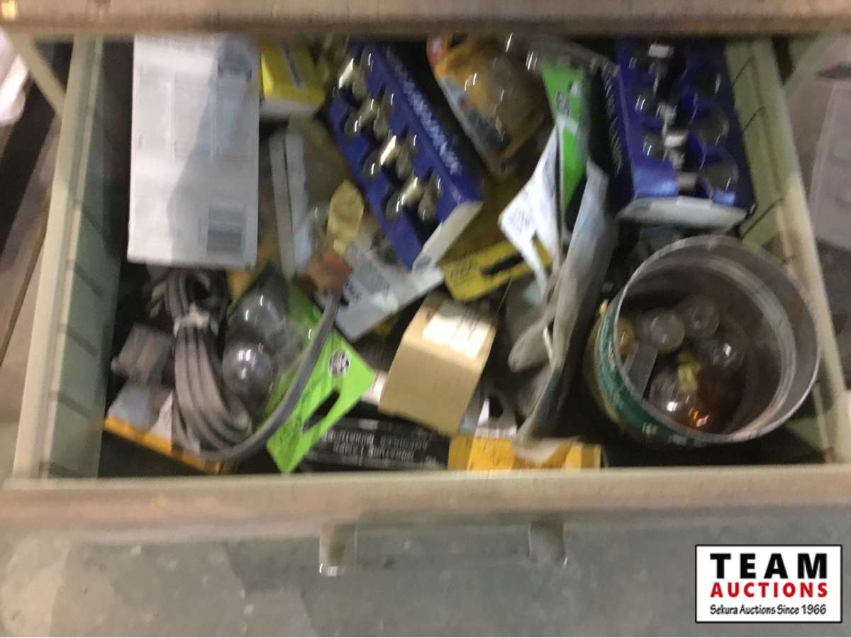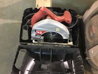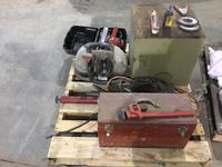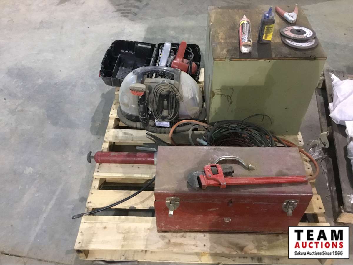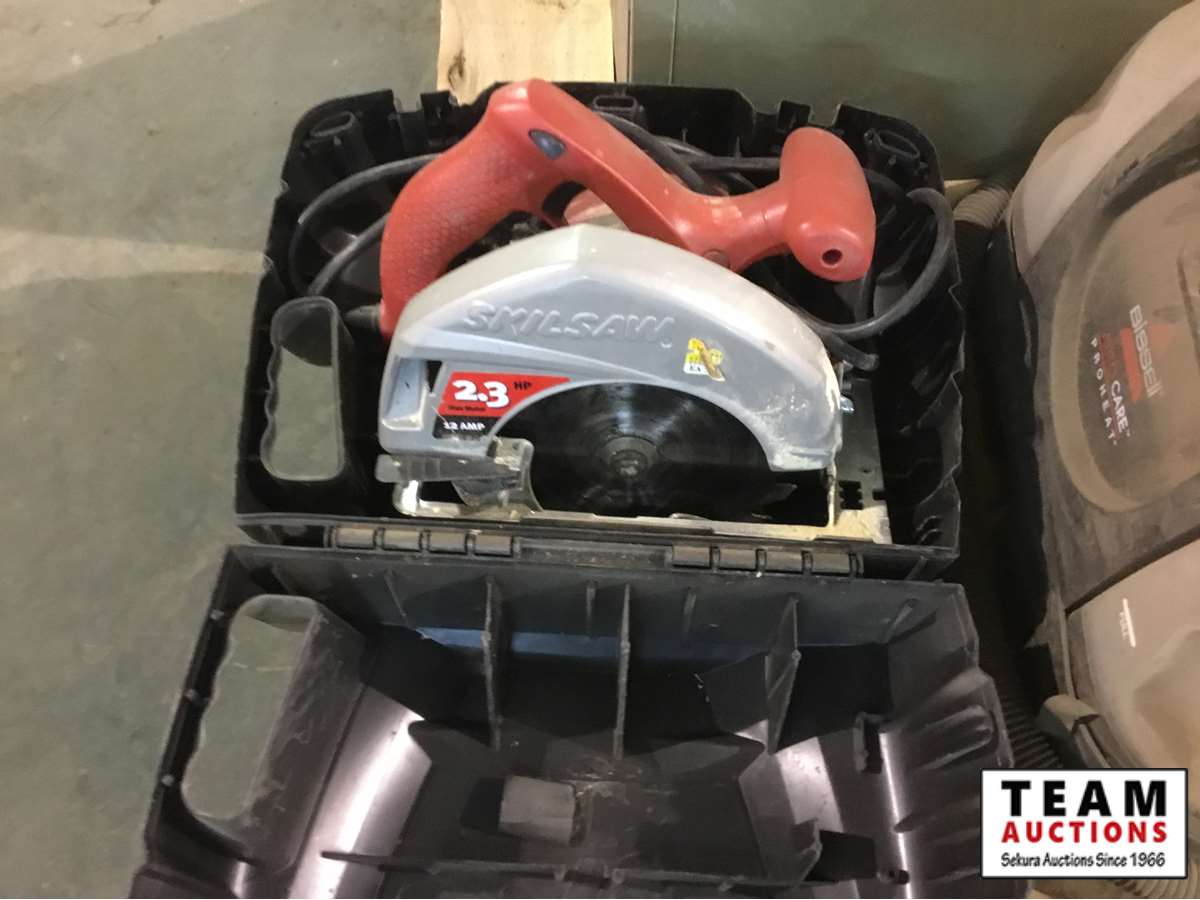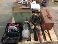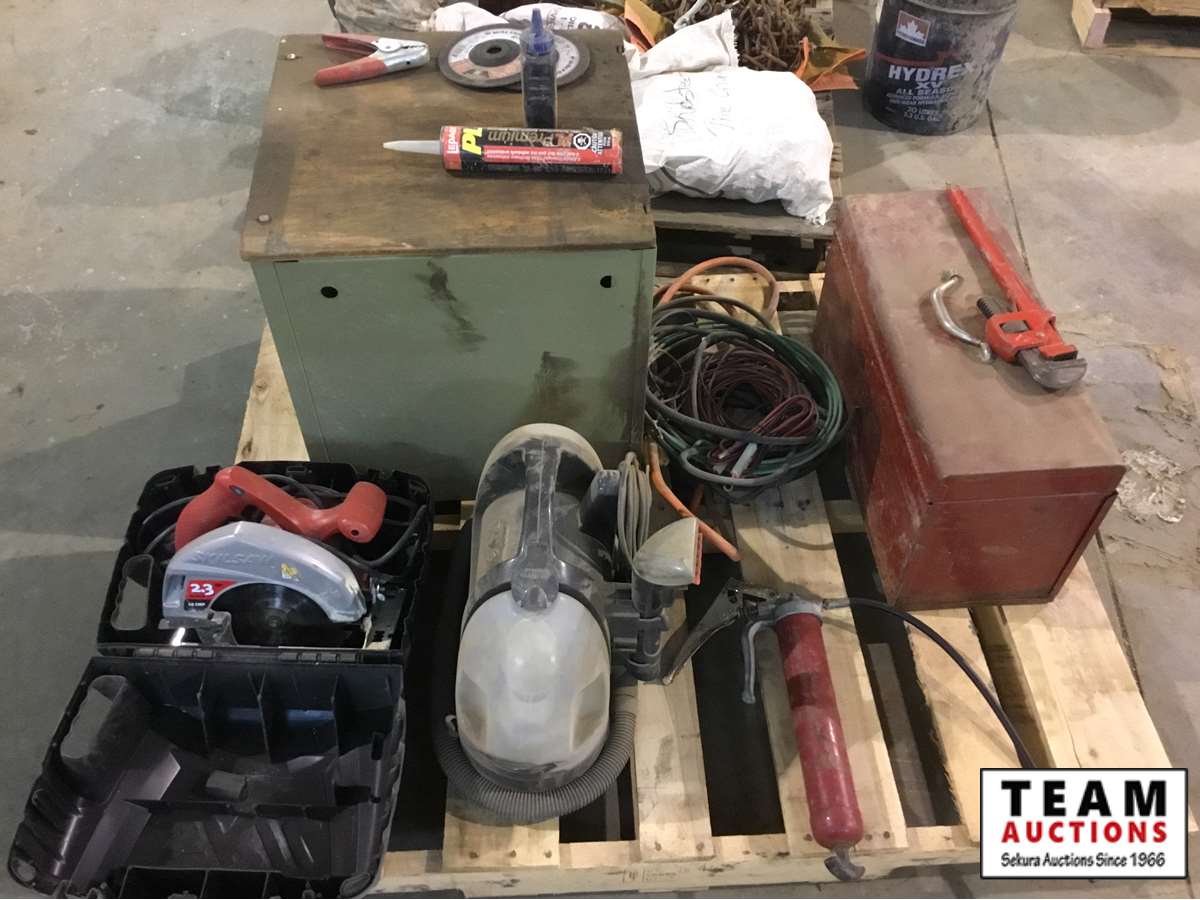 Skil saw, tool box, grease gun, pipe wrench, assortment of automotive bulbs, etc