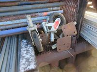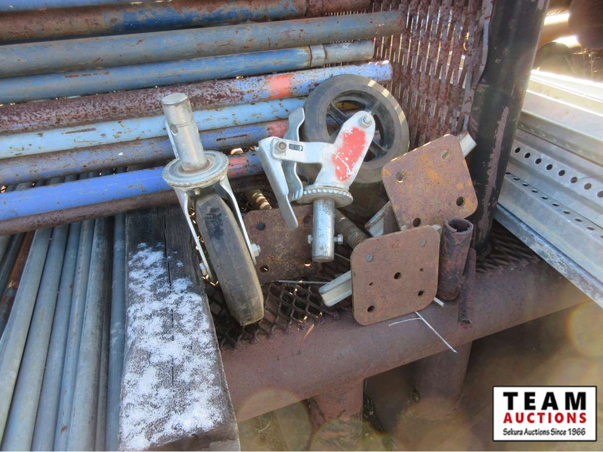 (20) end frames with cross bracing, (6) aluminum and plywood planks, (2) castor wheels, (8) adjustable leg stands