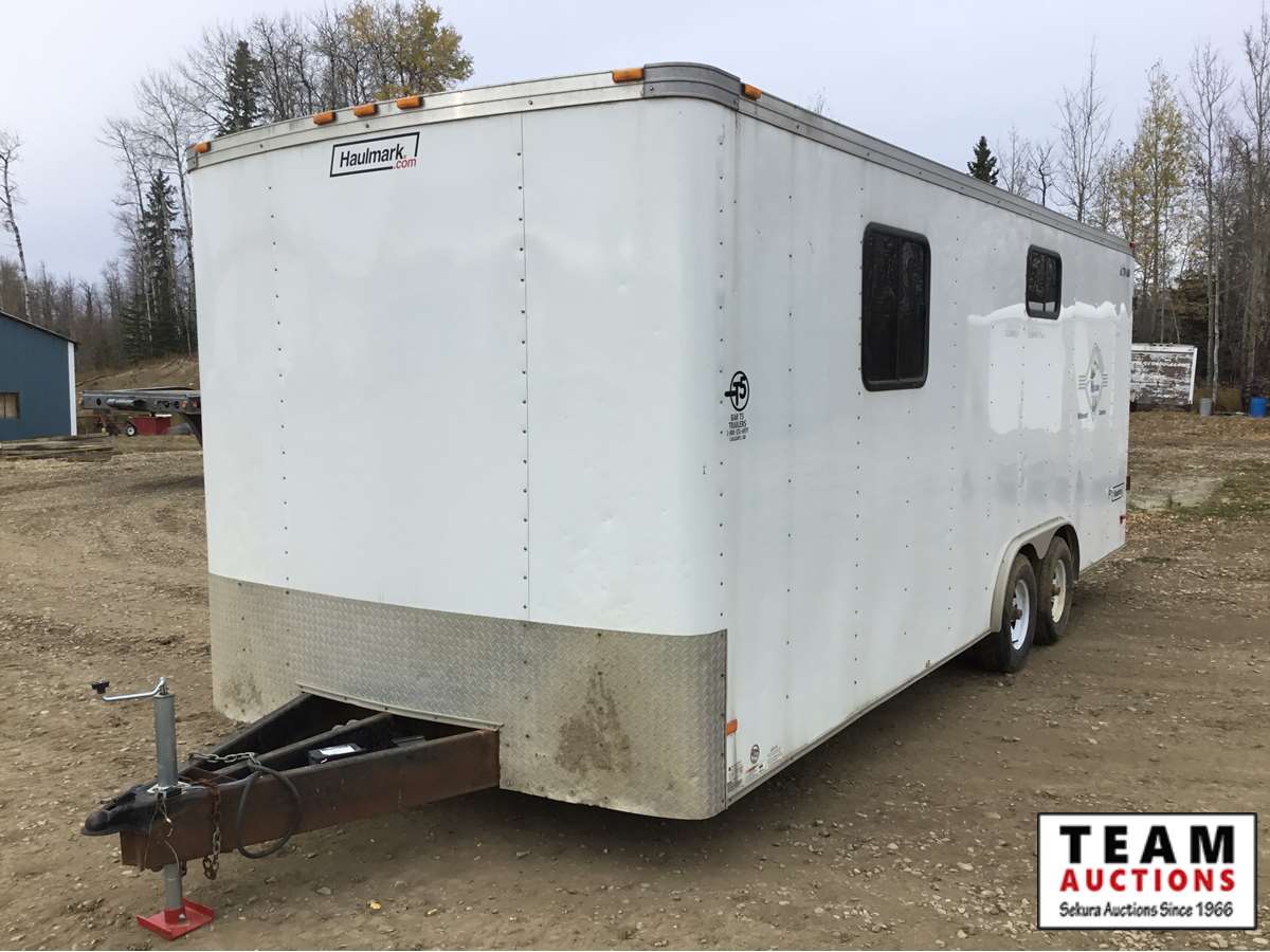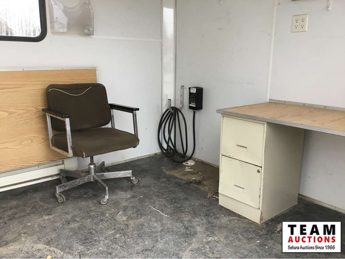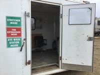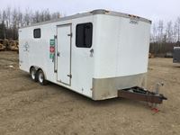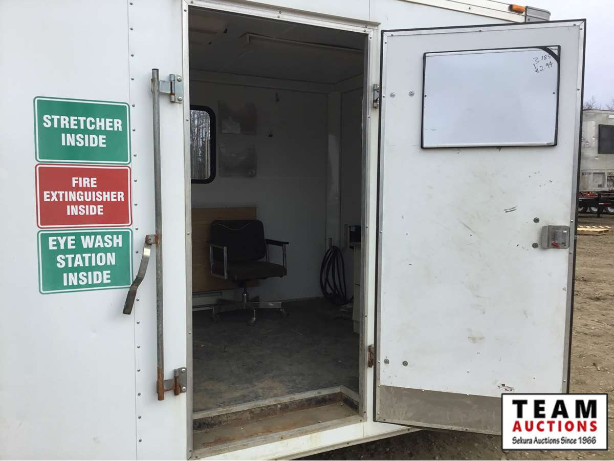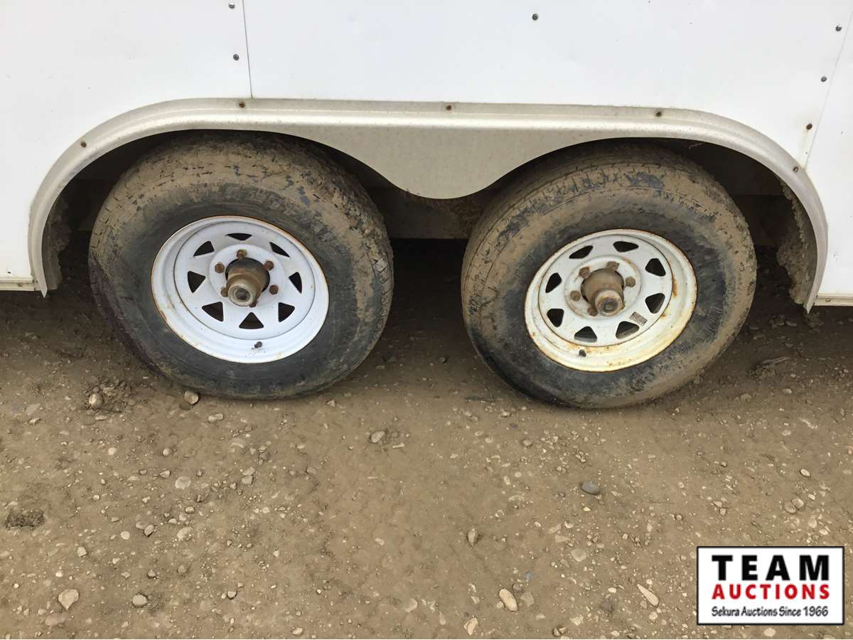 small front office, plywood lined, storage compartments, air conditioning, rear swing out doors, side man door, wired for 110 V, 3000 lb axles, spare, Alberta registered