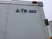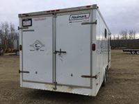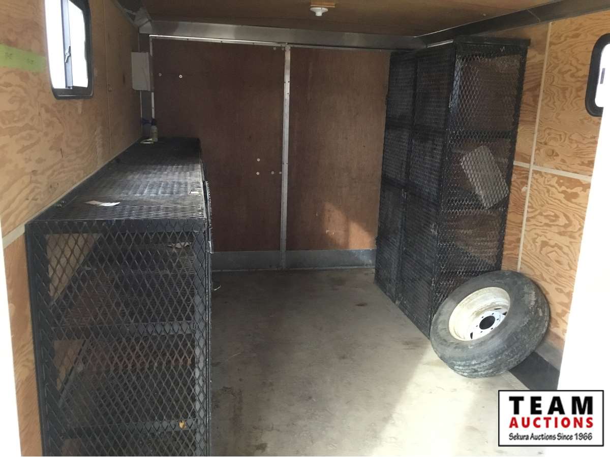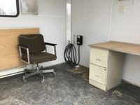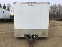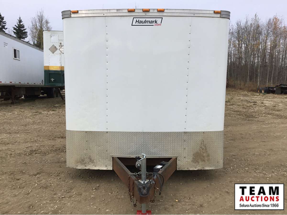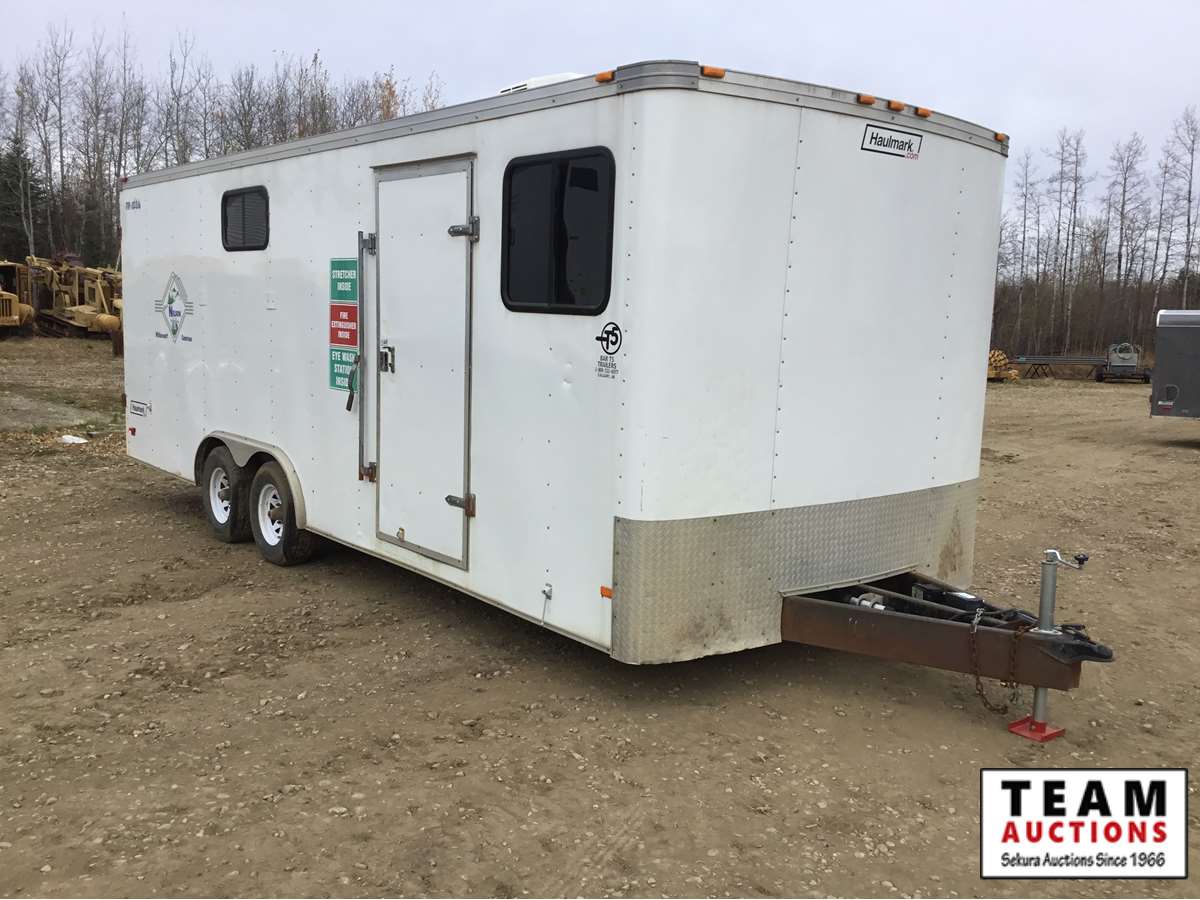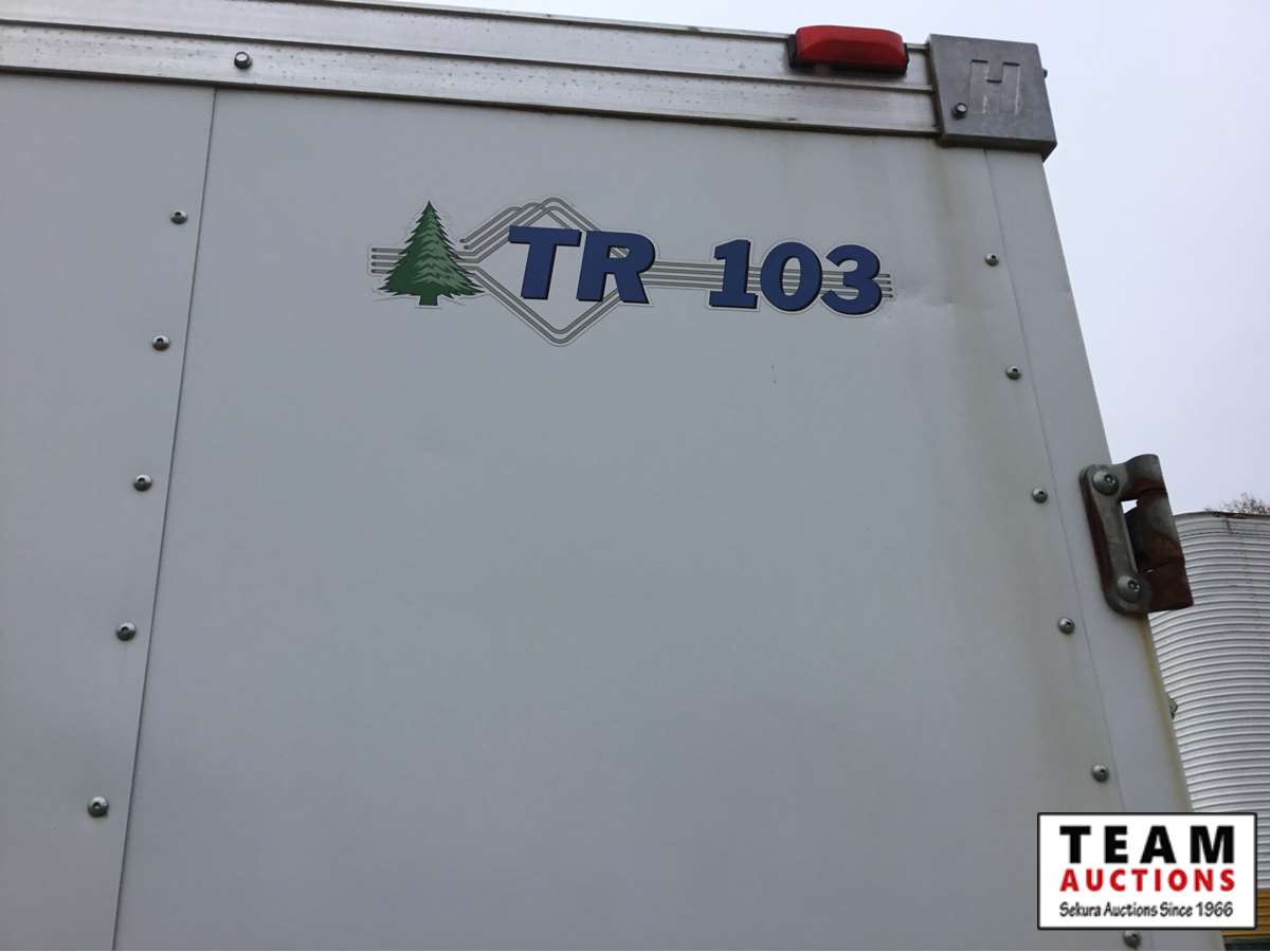 small front office, plywood lined, storage compartments, air conditioning, rear swing out doors, side man door, wired for 110 V, 3000 lb axles, spare, Alberta registered