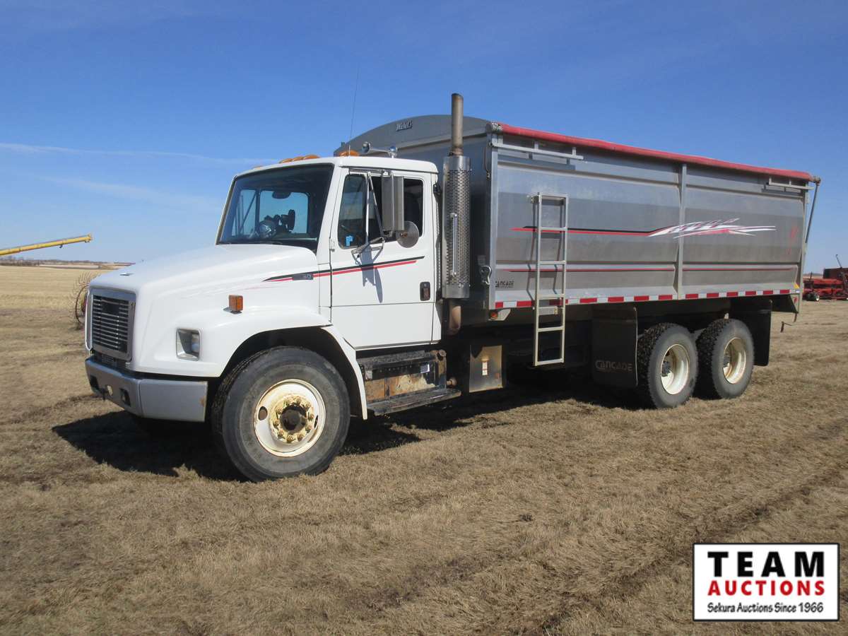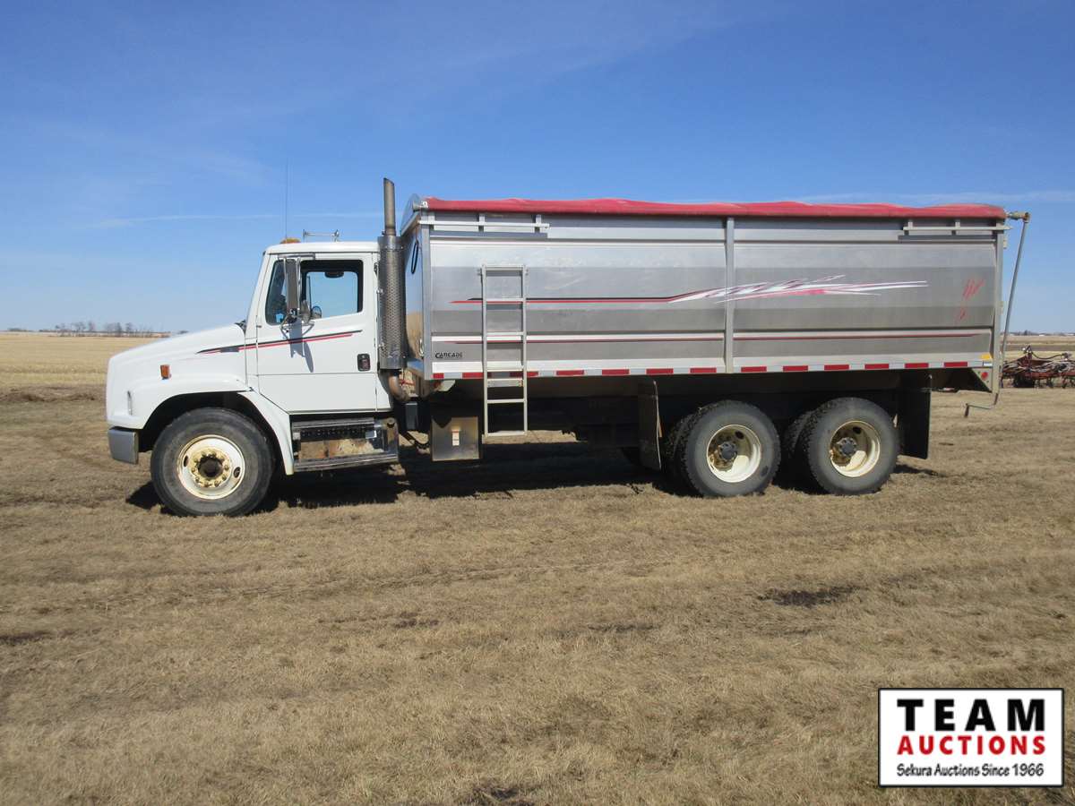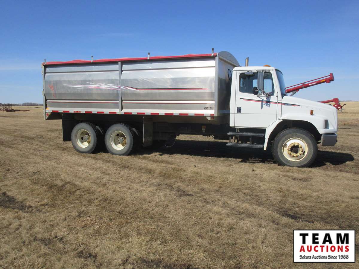 Cummins diesel engine, Allison transmission, Henderson Torflex suspension, 11R22.5 tires, like new 20' Cancade aluminum box, Michel's roll tarp, remote chute opening, rear hoist switch, rear hitch, Alberta registered