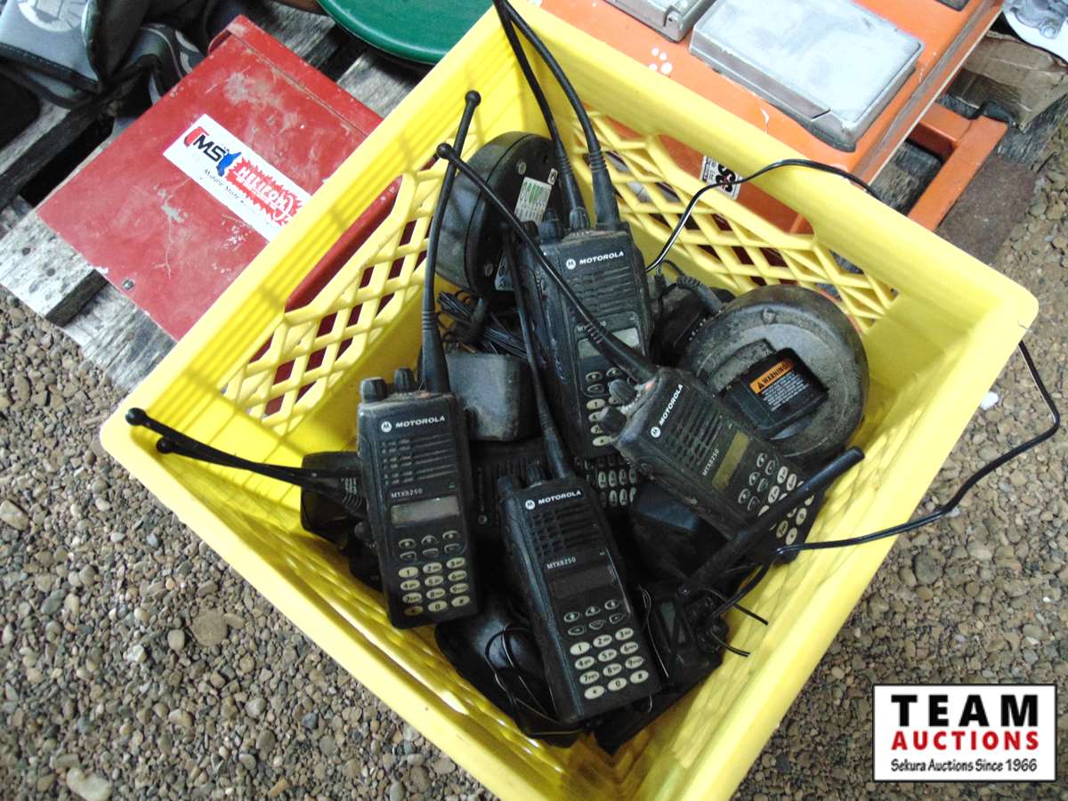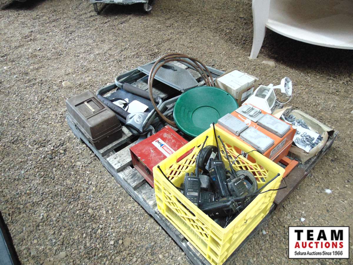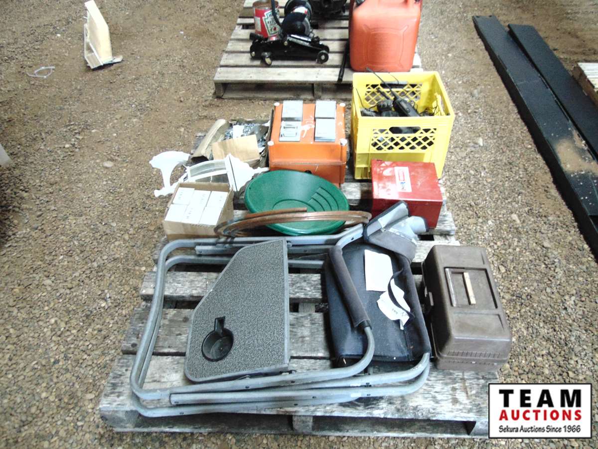 (2) chairs, box of Motorola walkie talkies, box of battery terminals, other miscellaneous items