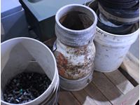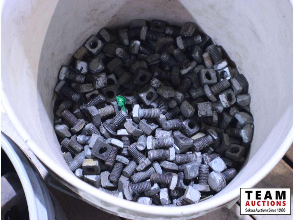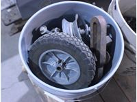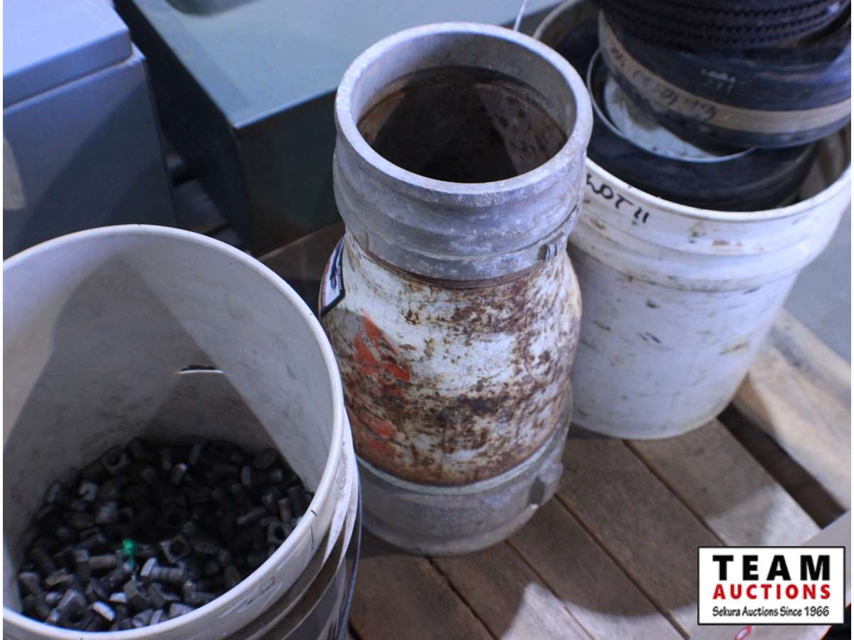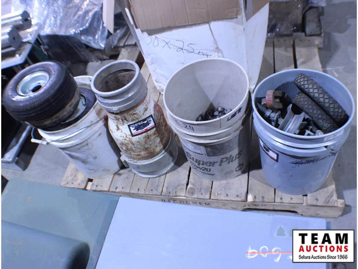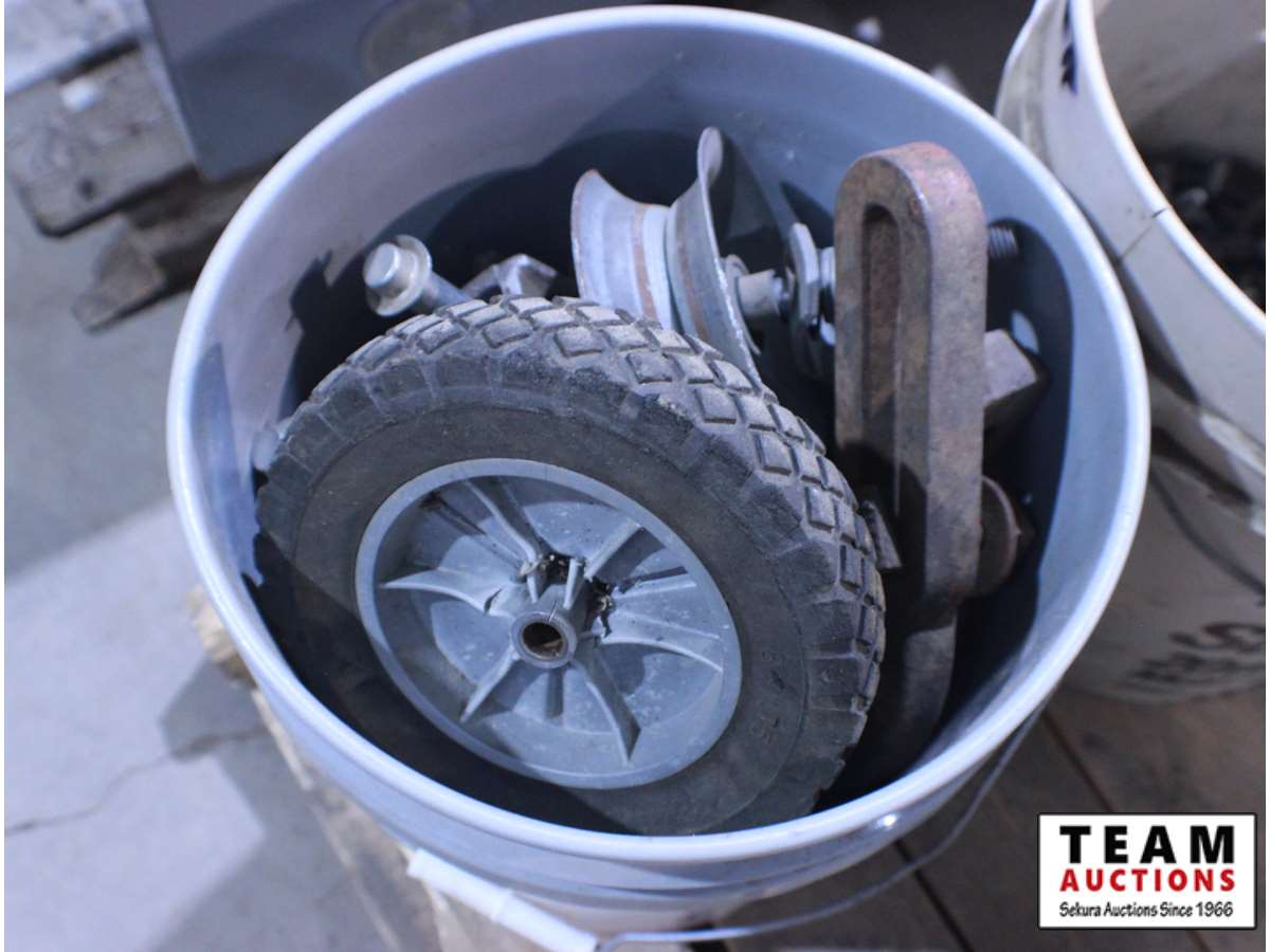 (1) bucket w/lawn mower wheel, pulley, misc. hardware, (1) bucket w/misc. nuts & bolts, large coupler, (1) bucket w/misc. small equipment wheels