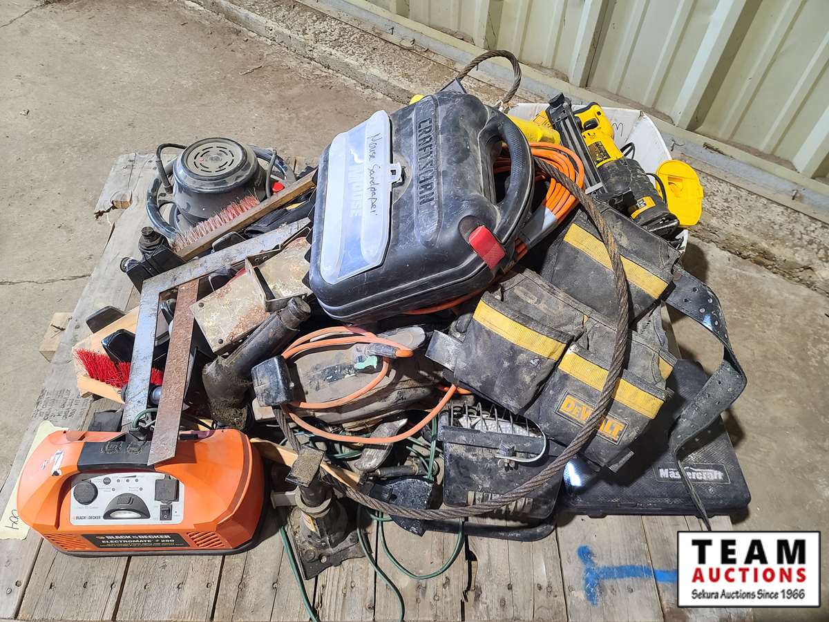 battery charger, choker, squares, tool belt, drills, buffer, jacks, sander & lights