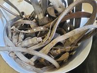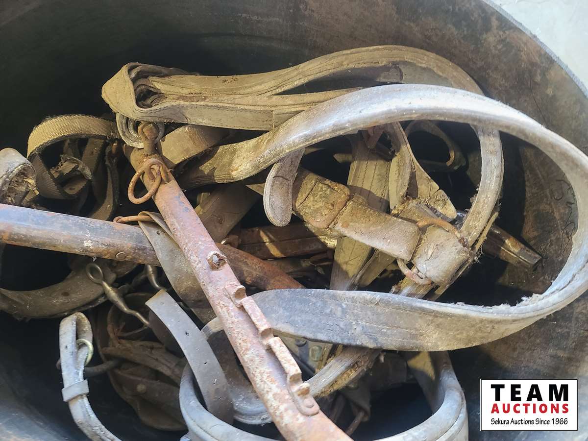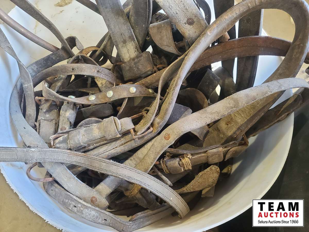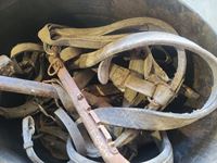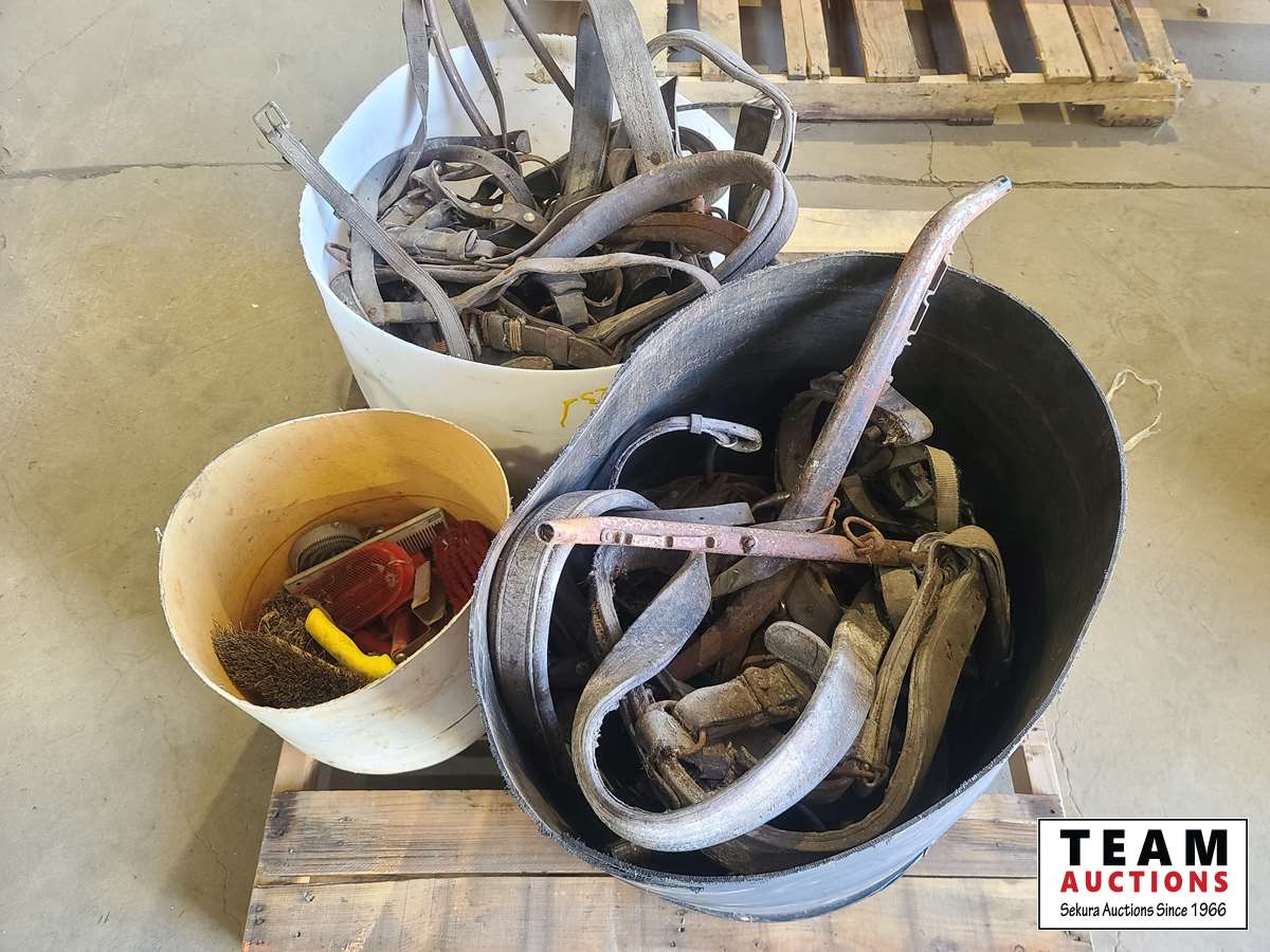 1500 (2) Tubs of Old Horse Tack & (1) Tub Misc Brushes