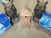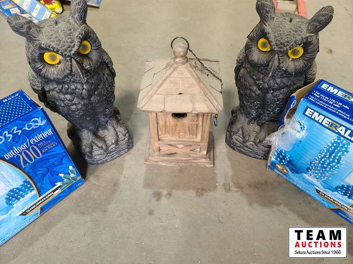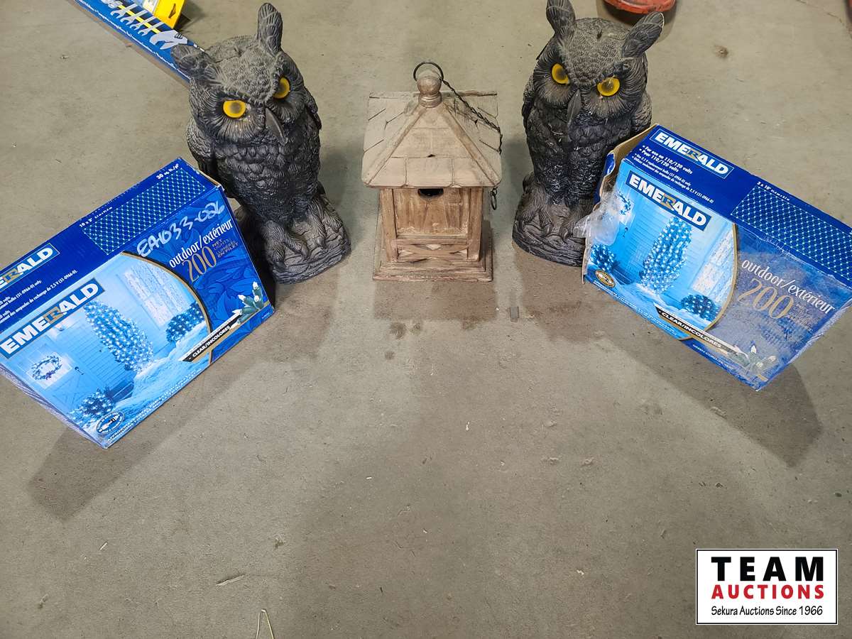 1291 Bird House, (2) Owls & (2) Boxes of Lights