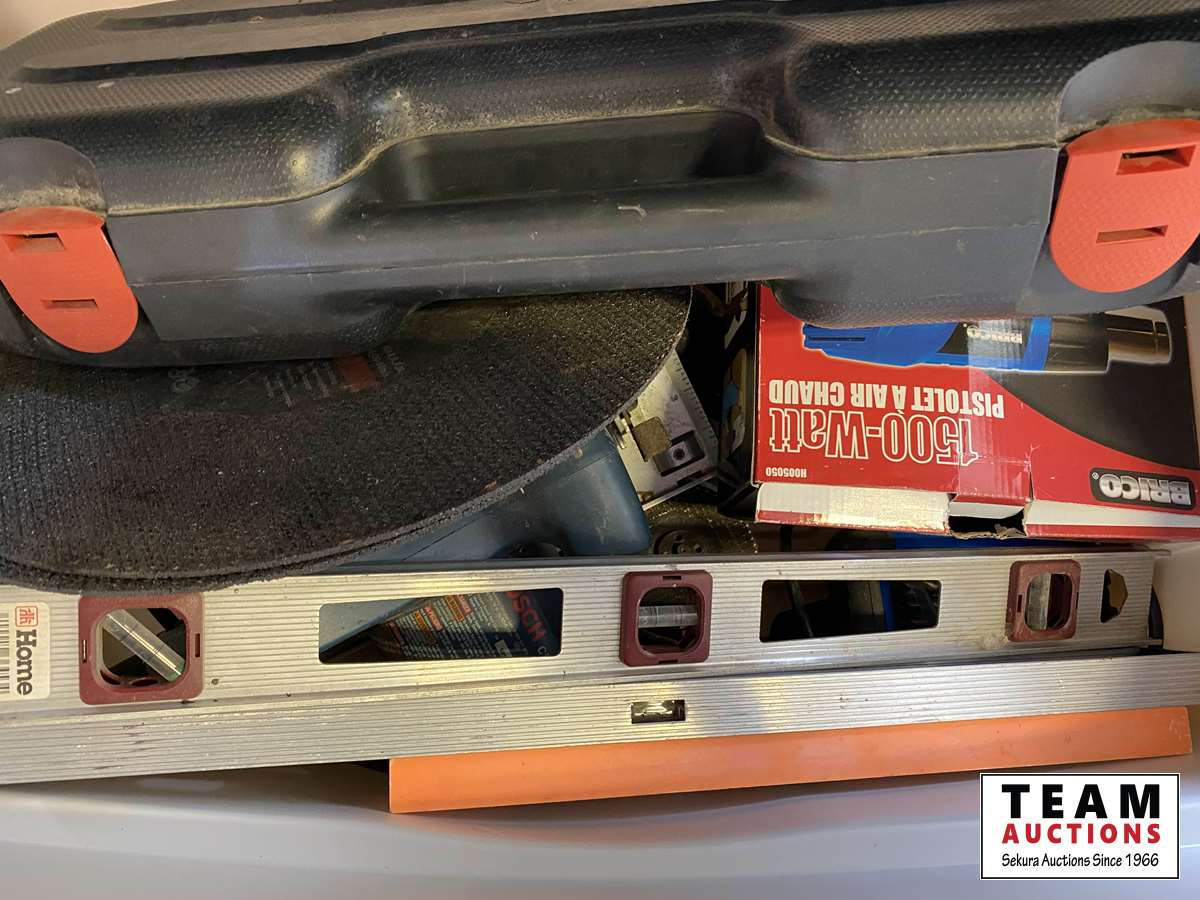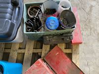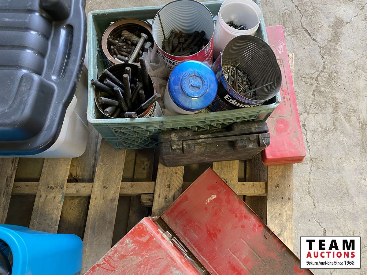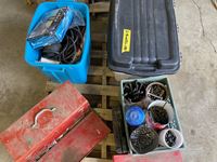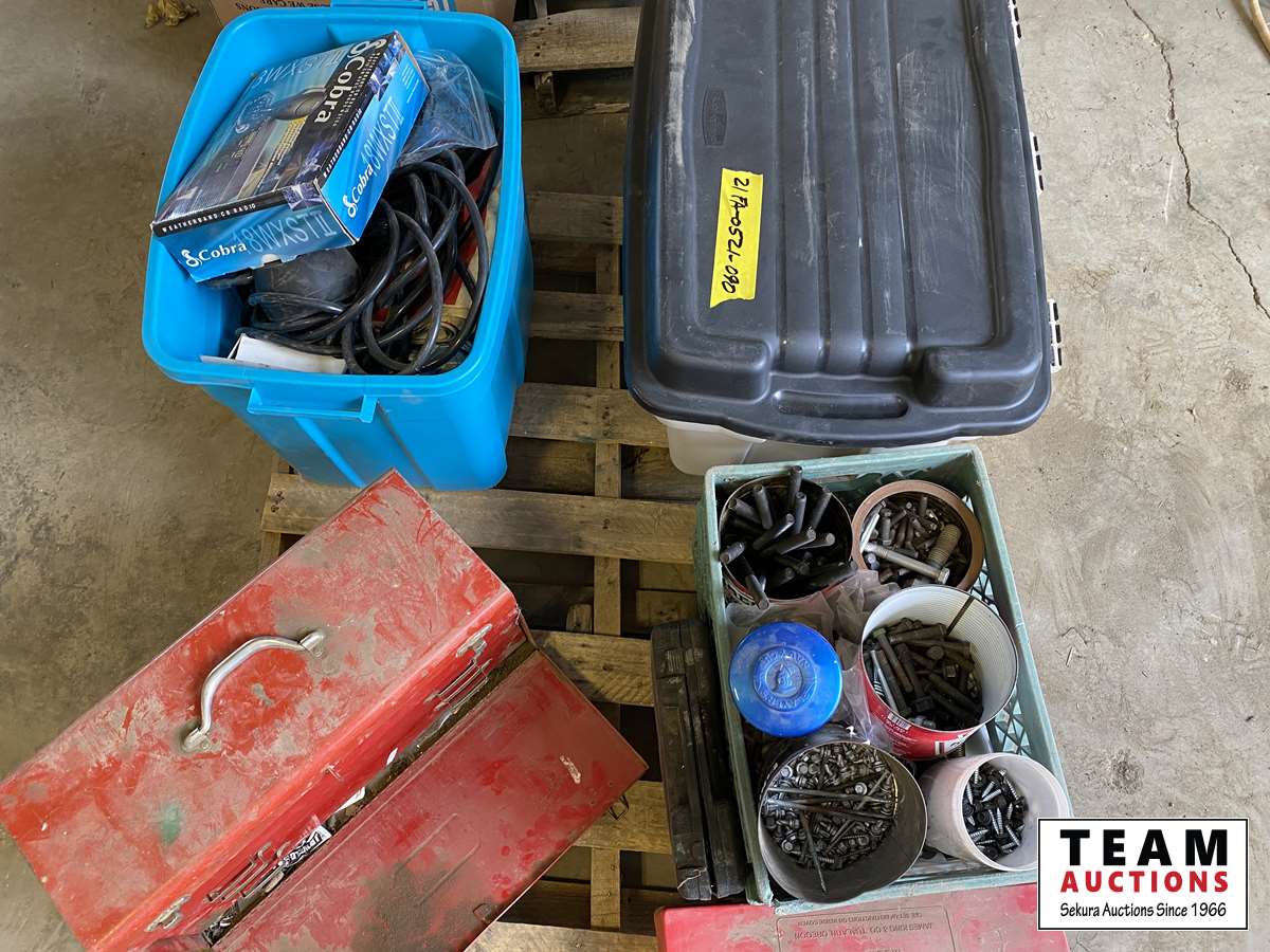 misc tools, bolts, tool box w/ tools, light cords