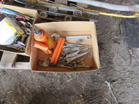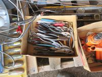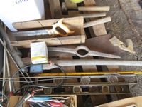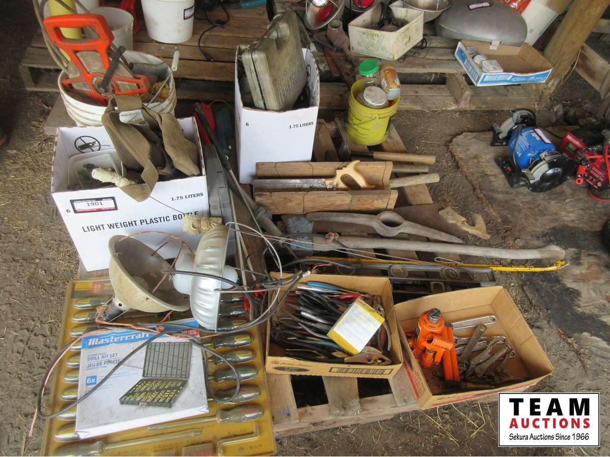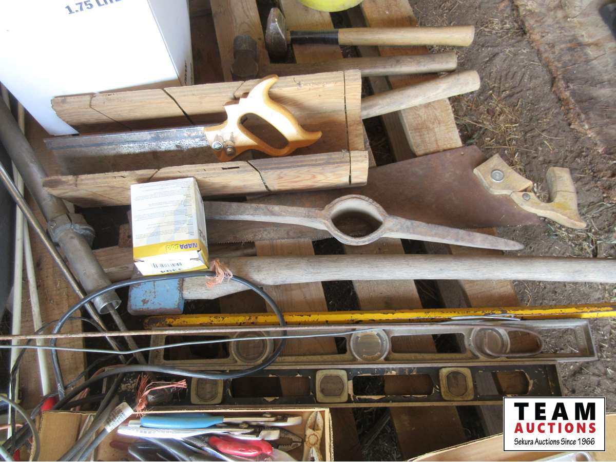Screwdrivers, levels, pliers, adjustable wrenches, 4 ton bottle jack, cattle prods, 200 ft tape, drill bit set, carpenter belts, miscellaneous