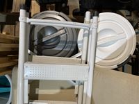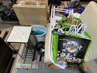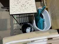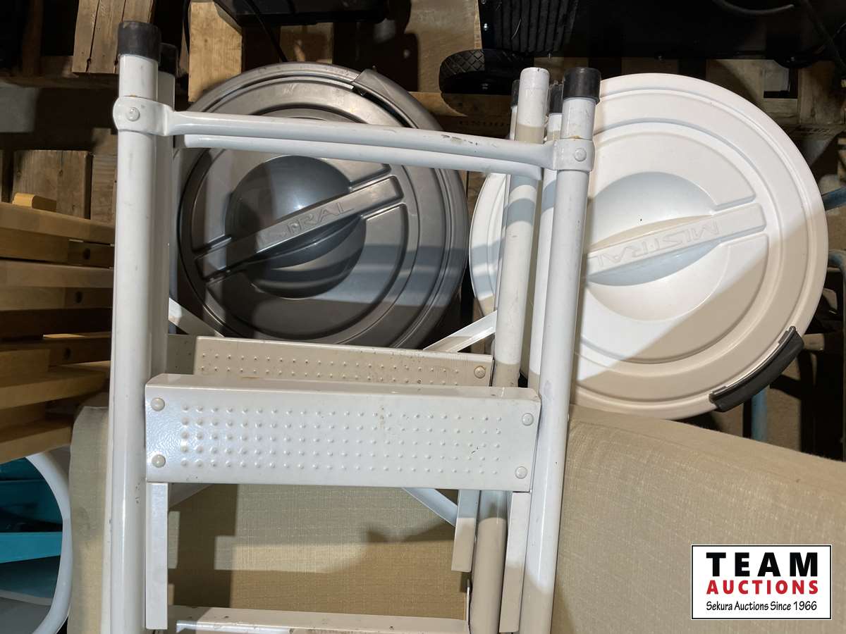 Ladder chair, tv stand, garage cans, plant stand, coat hanger, dust pans