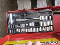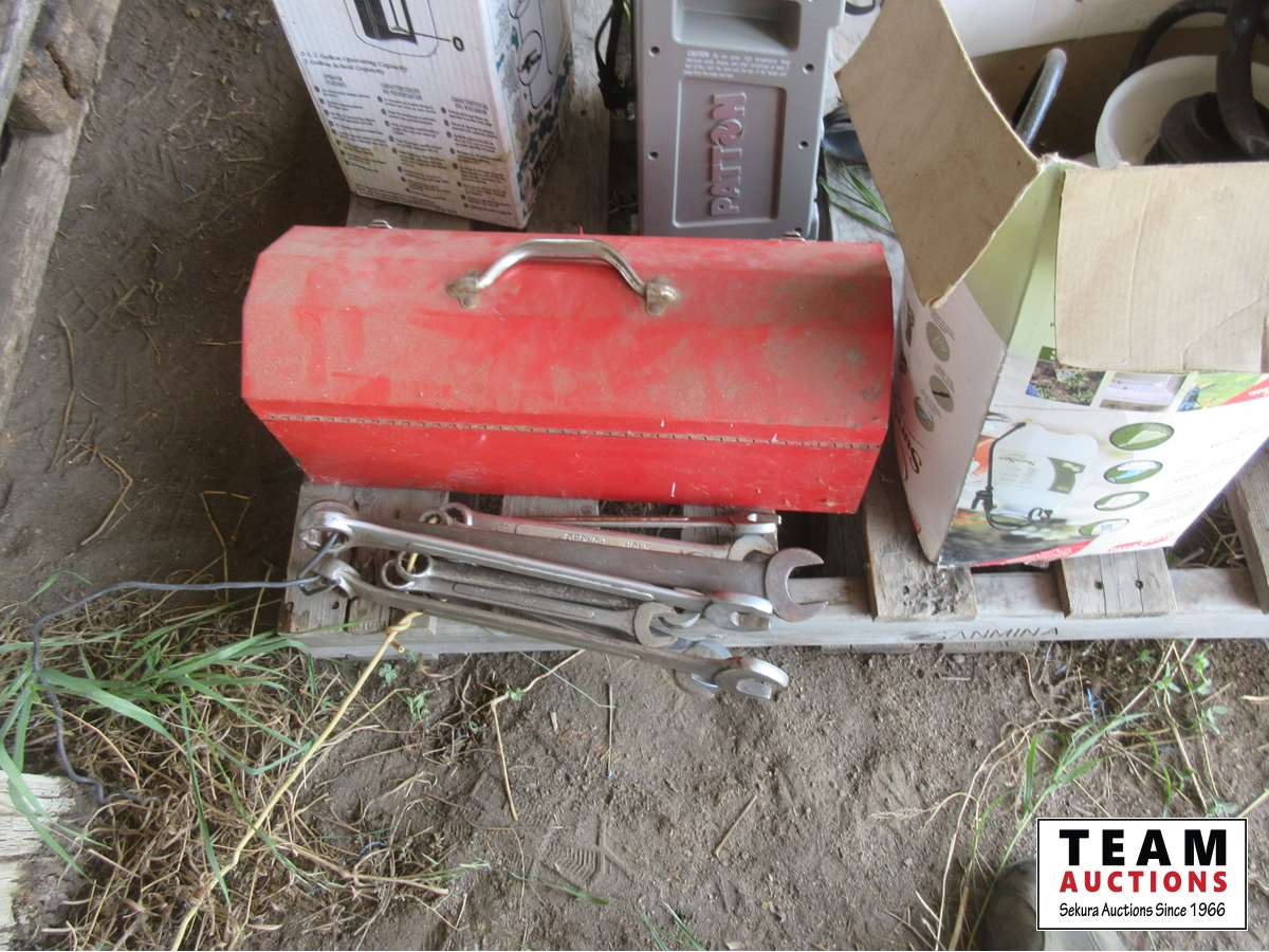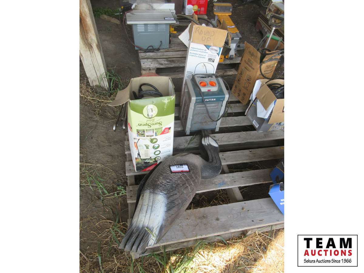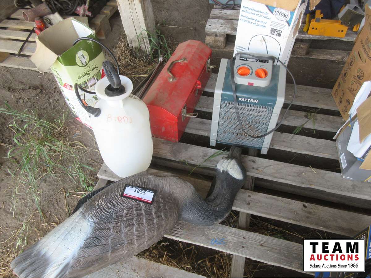 Goose decoys, (2) hand sprayers, Patton heater, wrench set, small tool box with tools