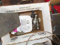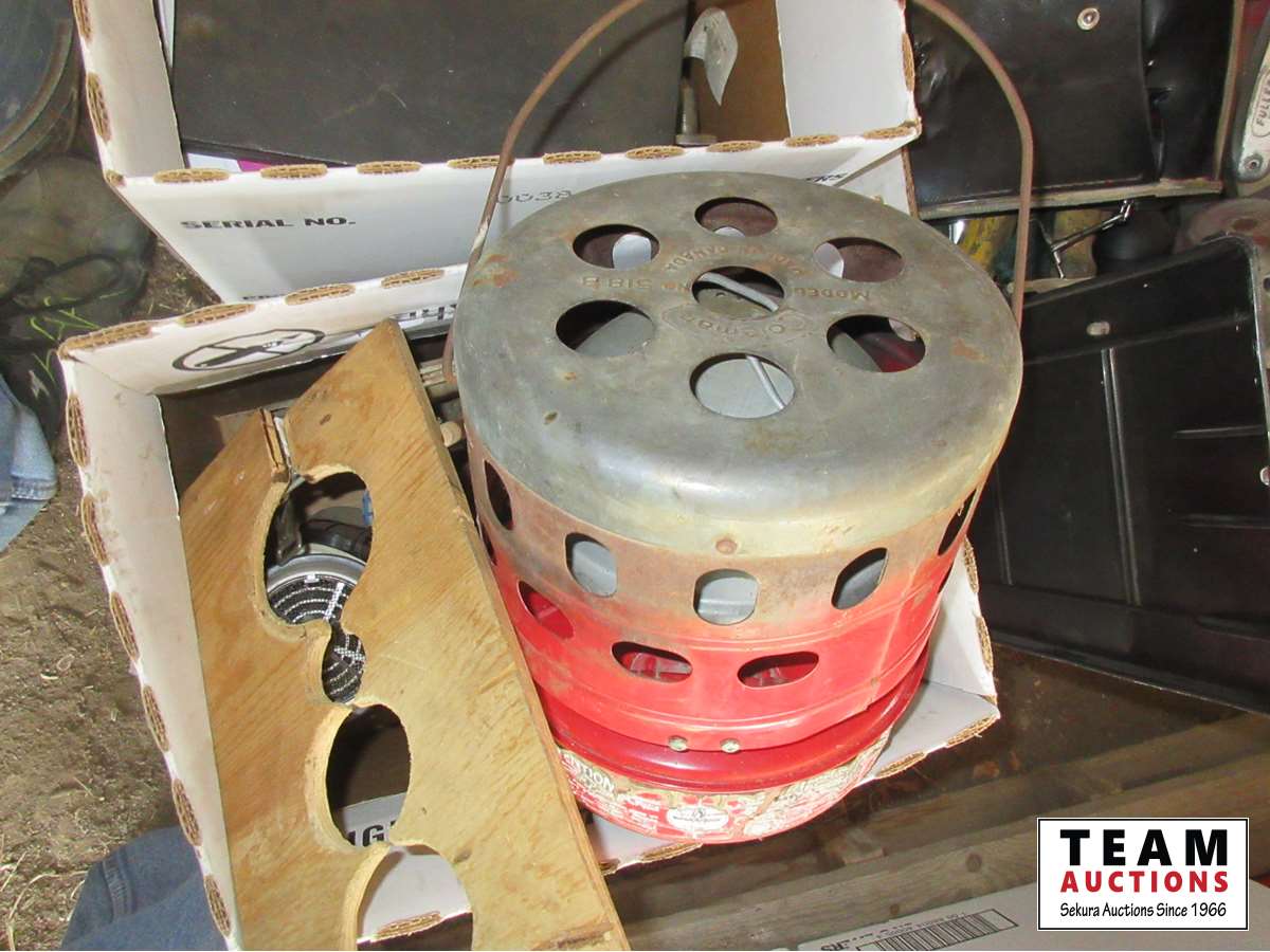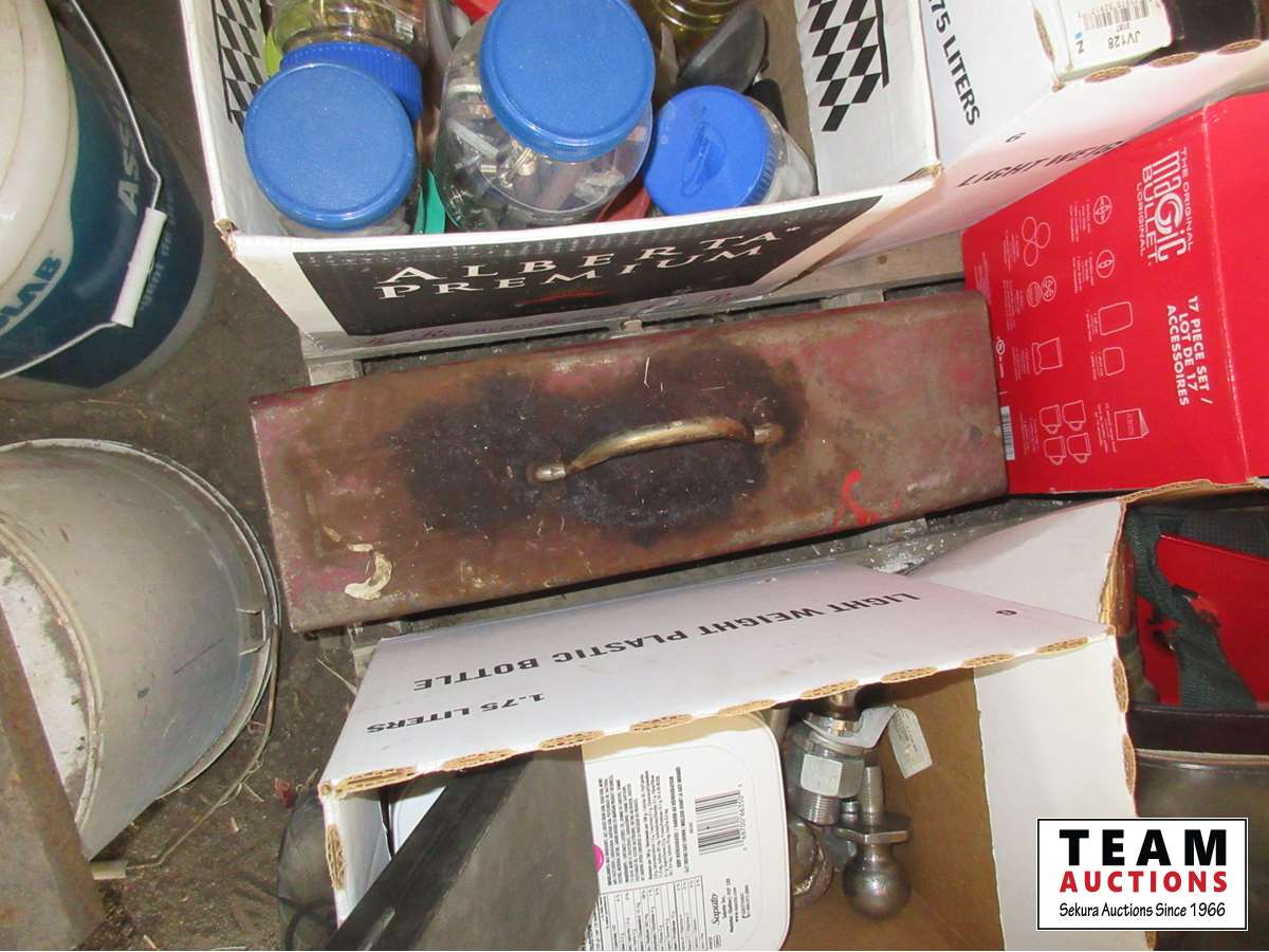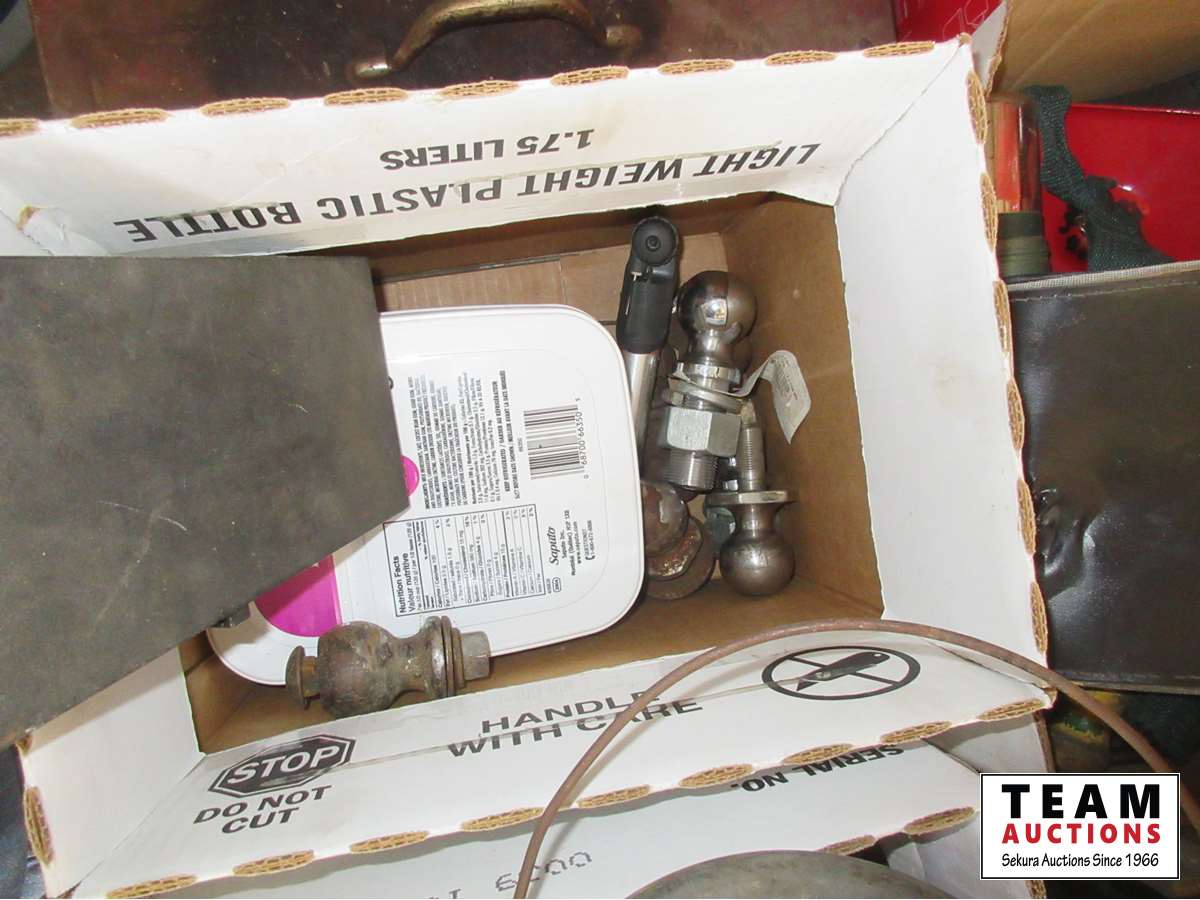 Saws, kerosene heater, tool box with tools, trailer balls, miscellaneous tool & hardware