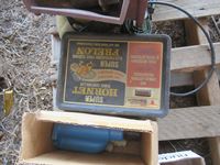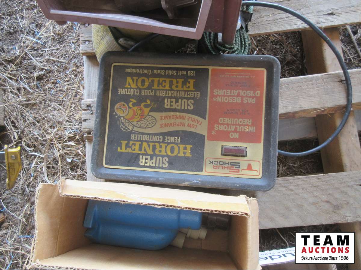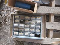 Paint stripper, floating water tank heater, gas tank lids, (25) drawer parts cabinet, gate latch, straps, roll of tin, electric fencer