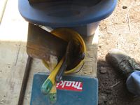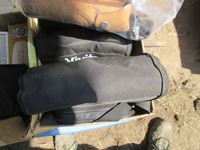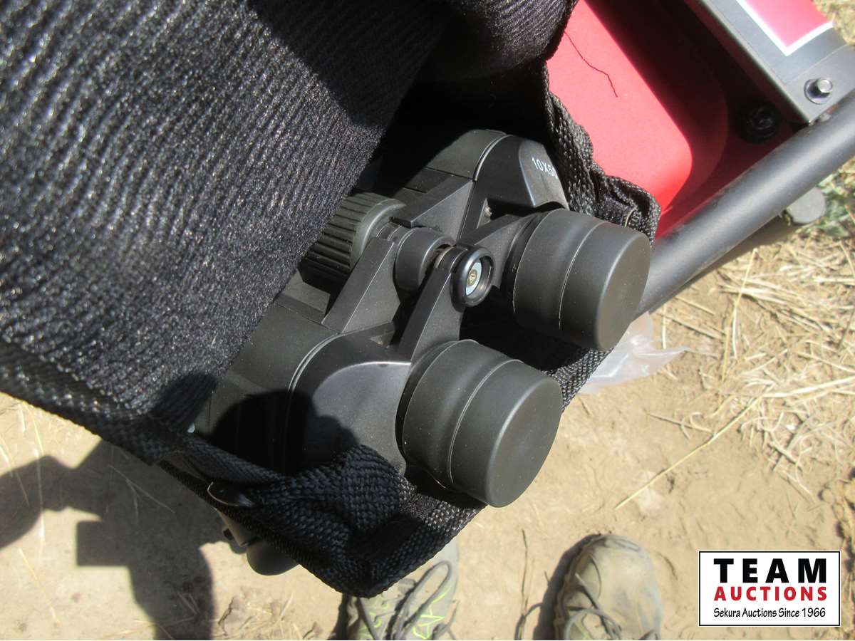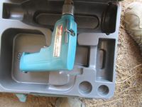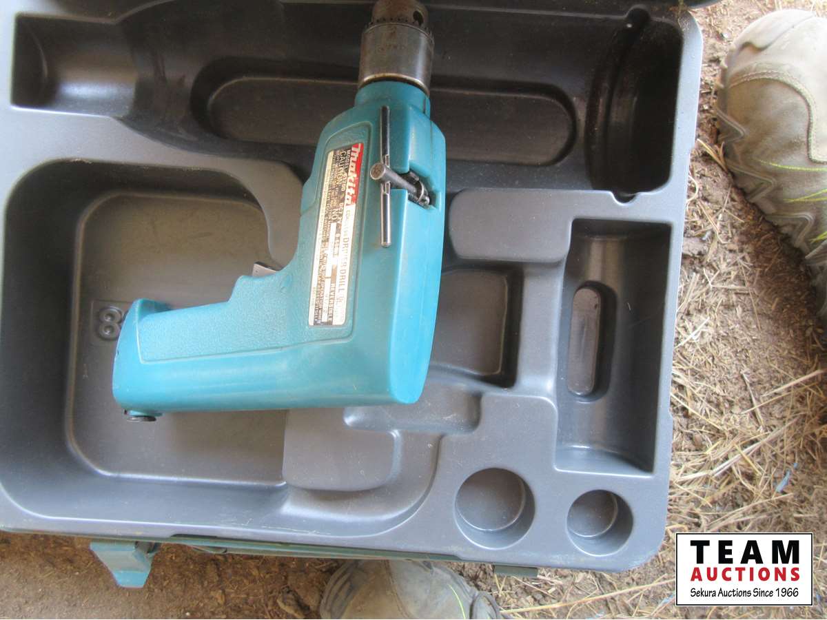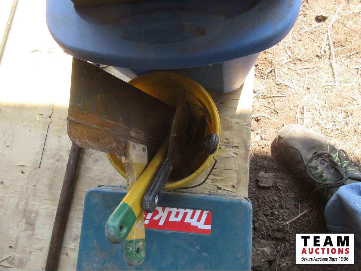 Trowels, box of binoculars, soaker pads, pry bar, small Makita drill