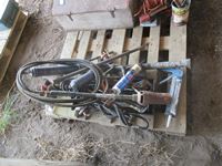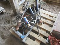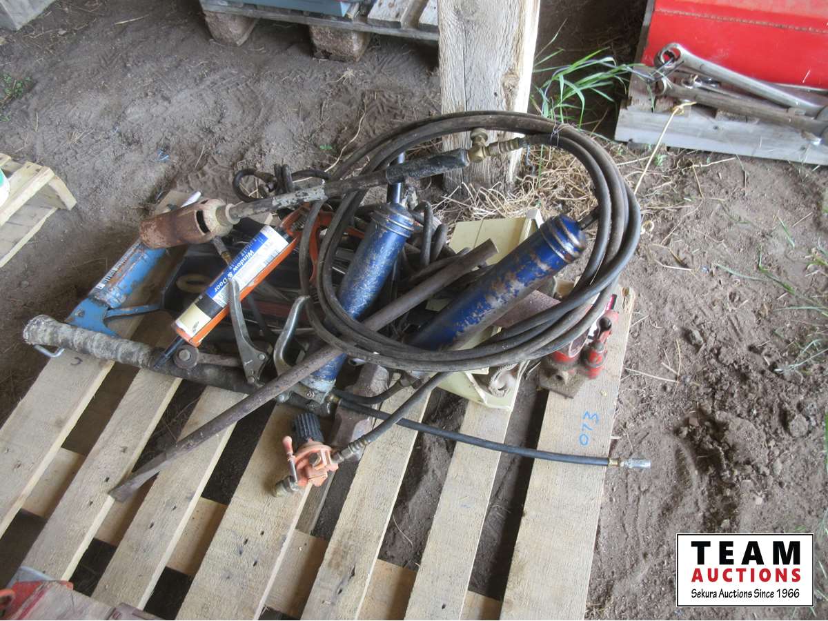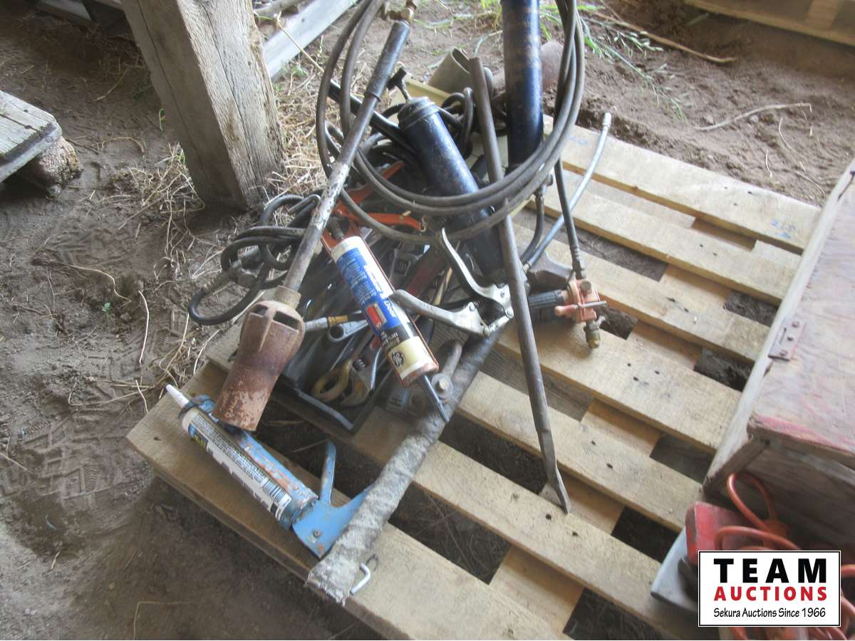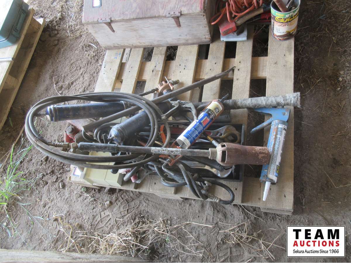 Grease guns, tiger torch, sledge hammer, tool box with tools, caulking guns