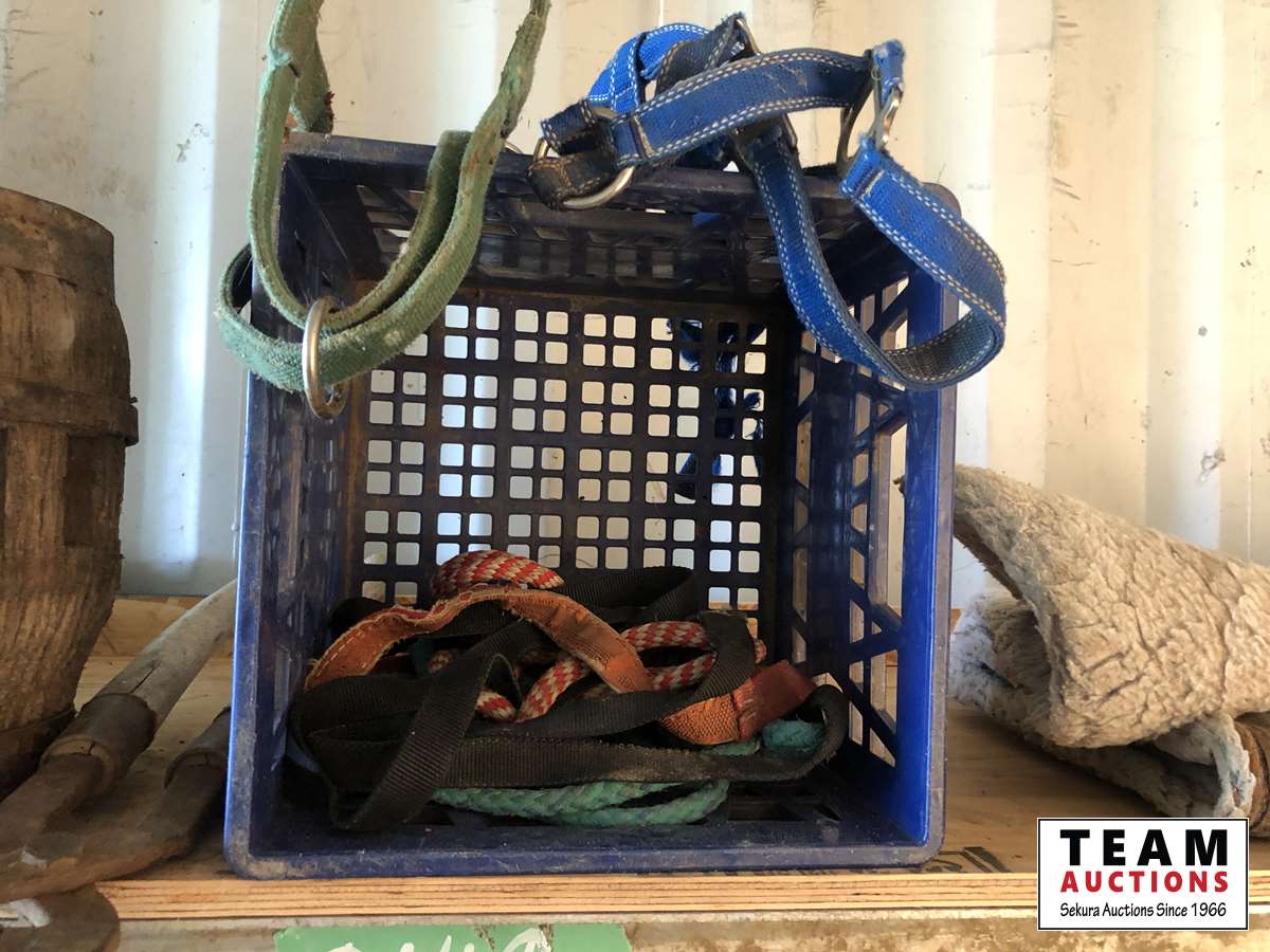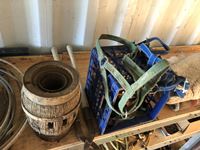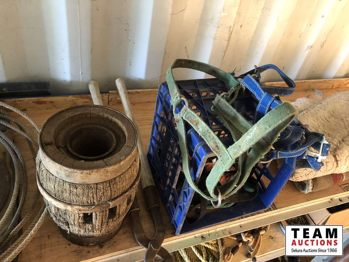 (3) Saddle blankets, lariat, hoof stand, wagon wheel hub, hoof trimmers, box of halters