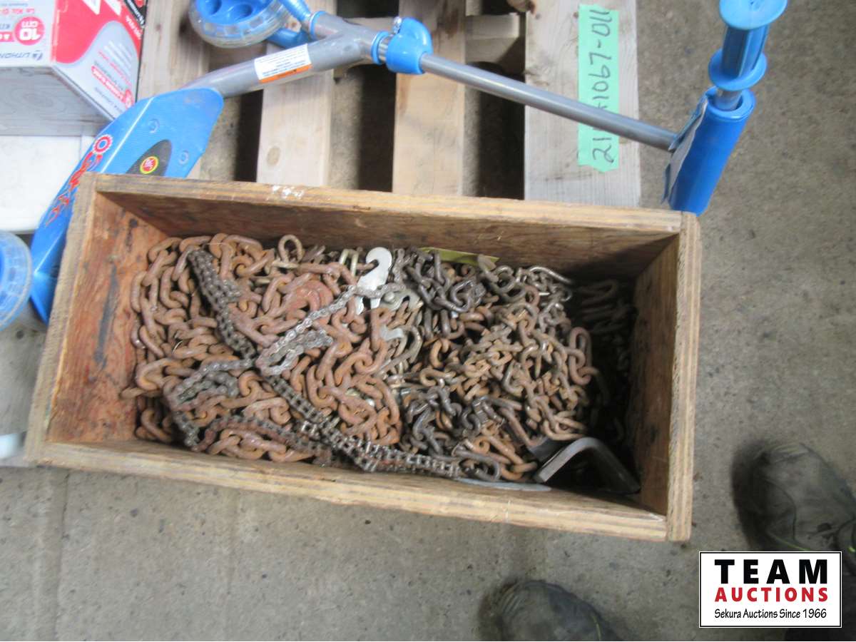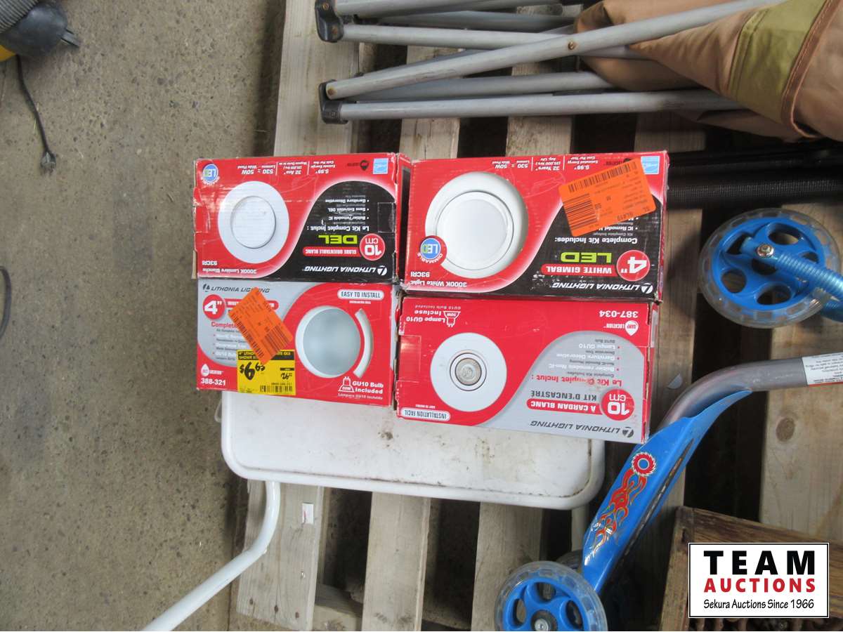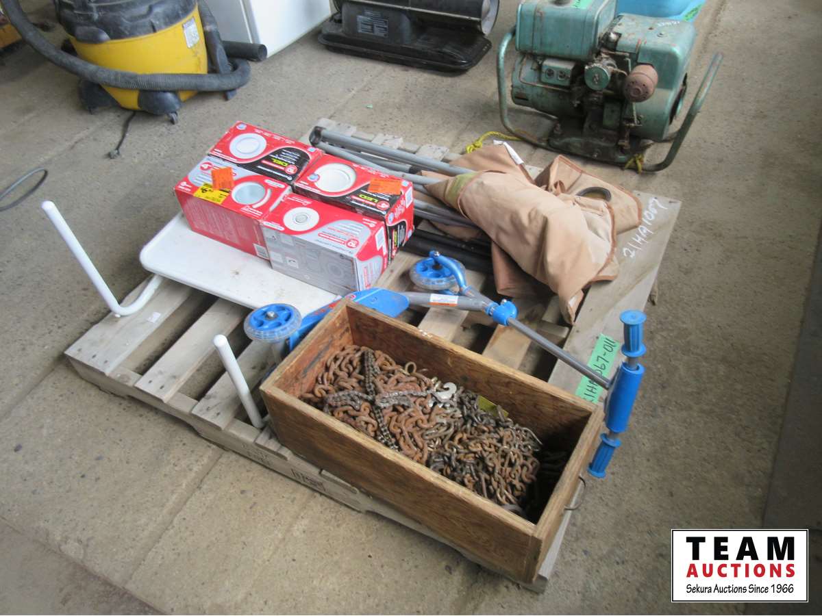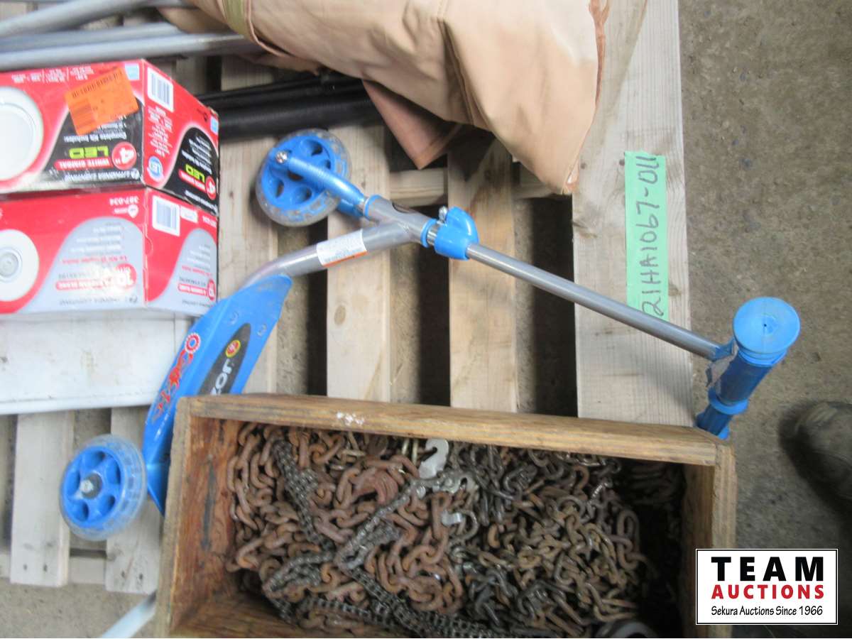 1718 Pallet with Lawn Chair, Kids Scooter, Tire Chains & (4) 4 Inch Pot Lights