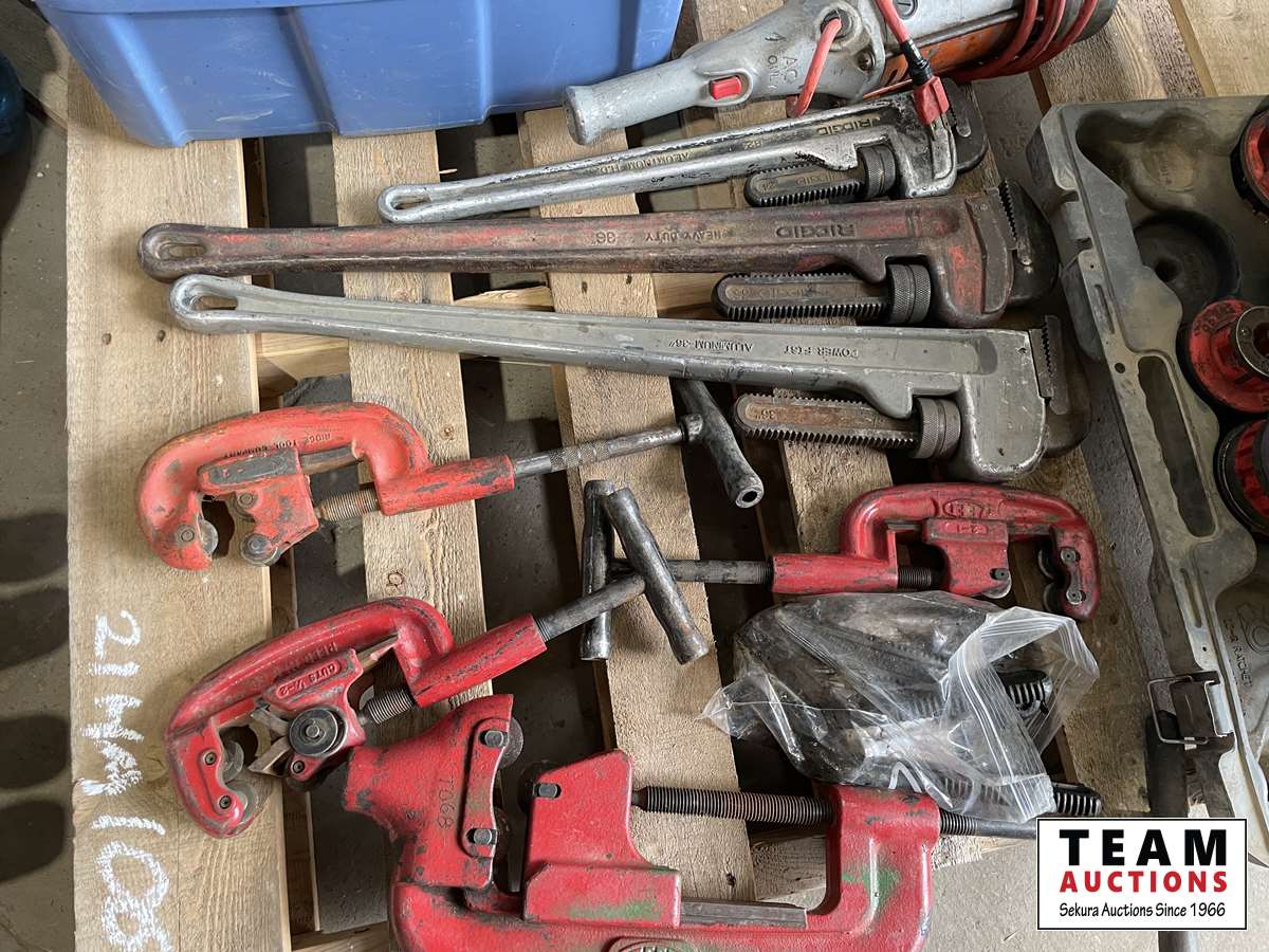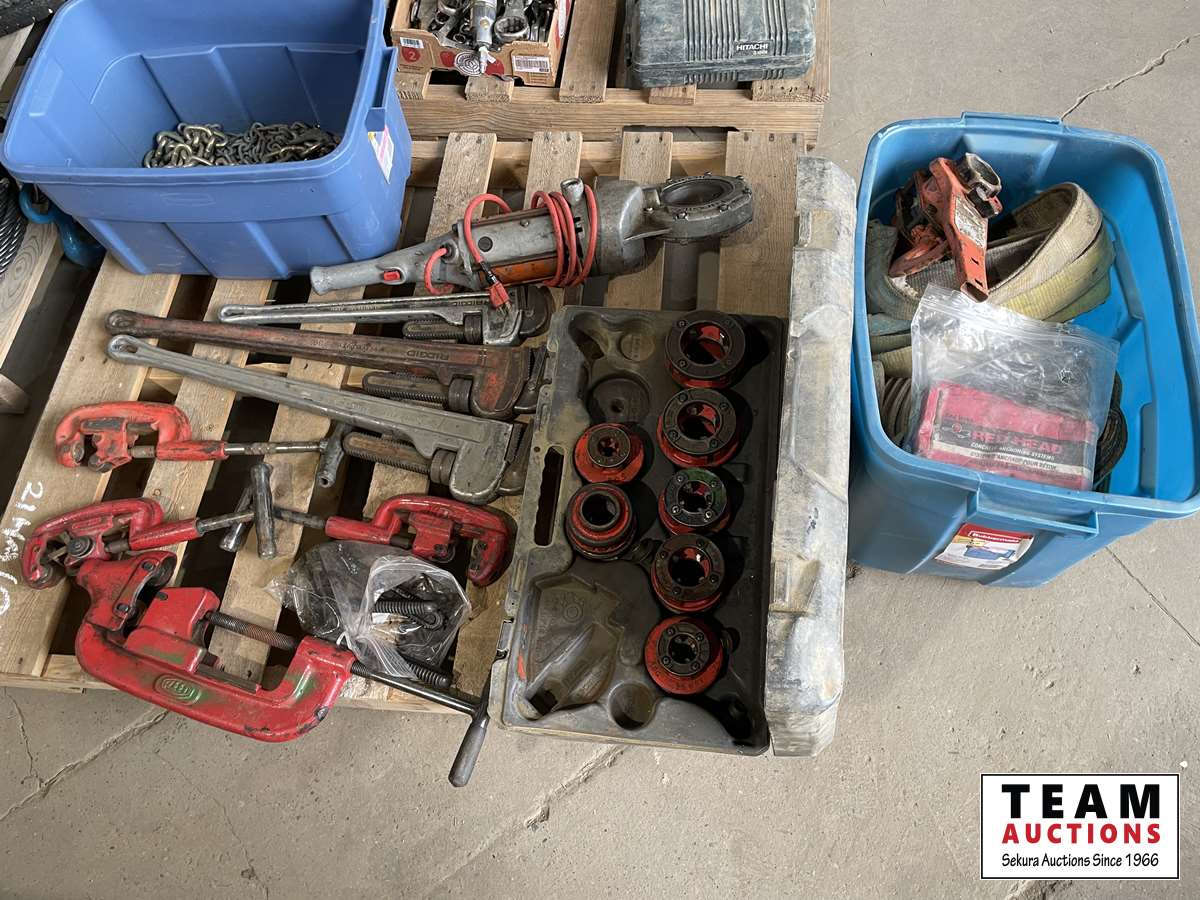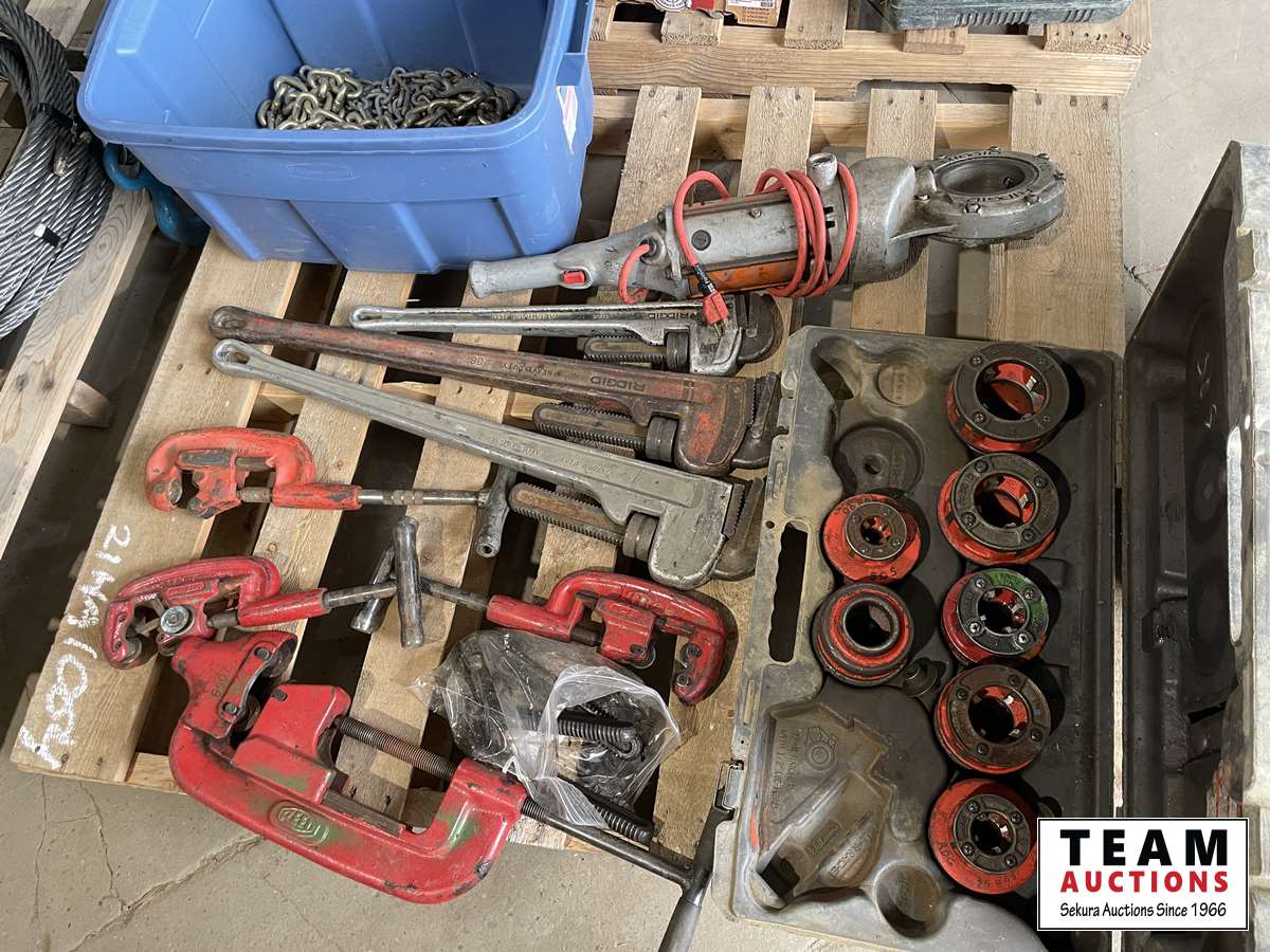Rigid 700 power threaders, fall set of threader heads, 0 inch -4 inch cold cutters, 0 inch -2 inch cold cutters, 36 ft pipe wrenches, 24 inch aluminum pipe wrench, 2 bins full of chains, slings and come along