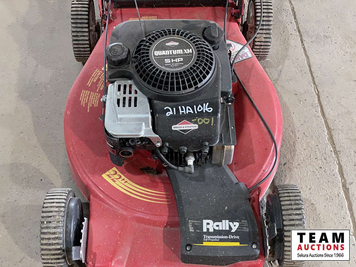 Briggs Quantum 5 HP gas engine, rally transmission drive self-propelled, 22 inch cutting deck, grass clippings bag