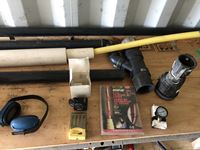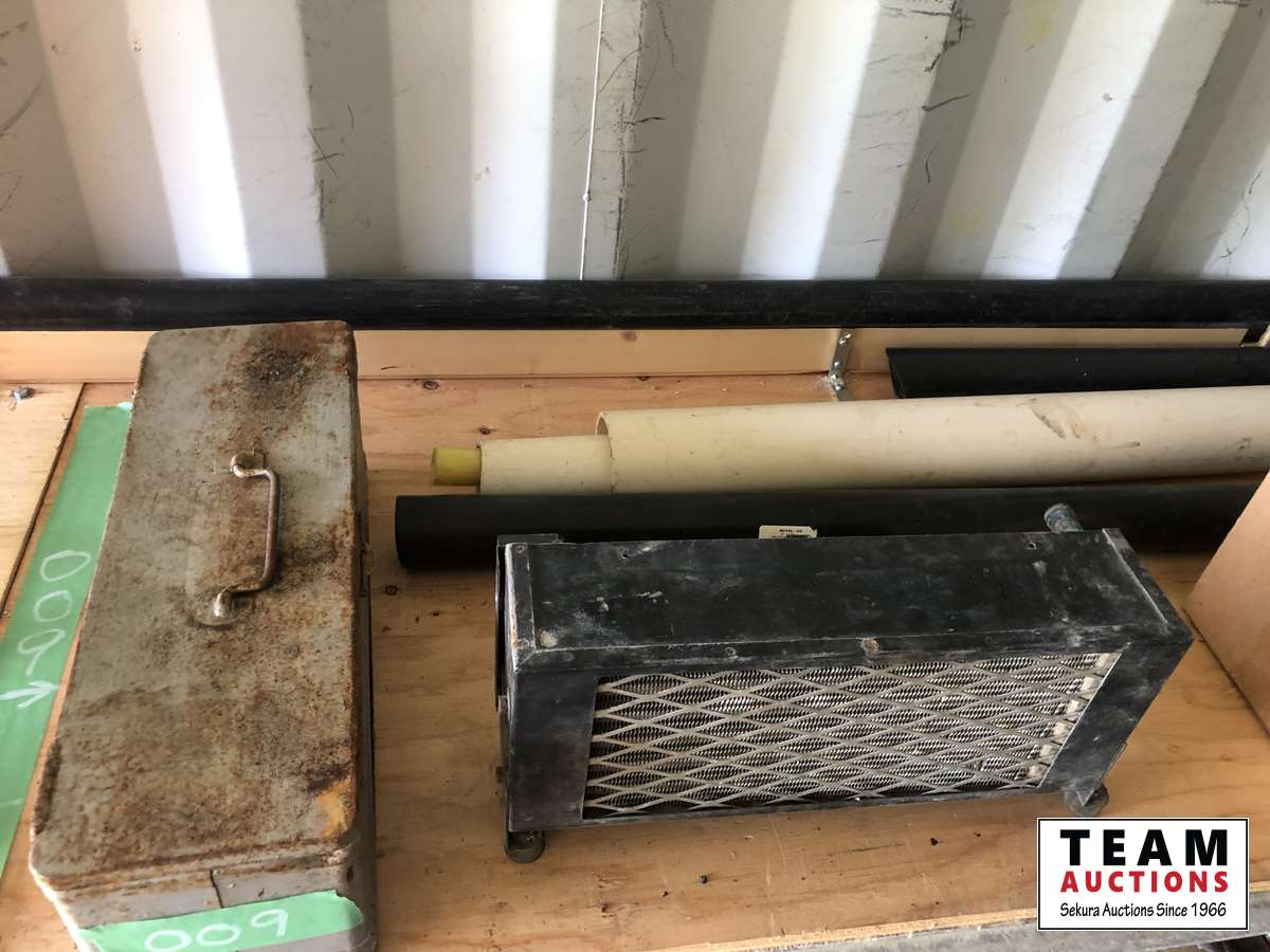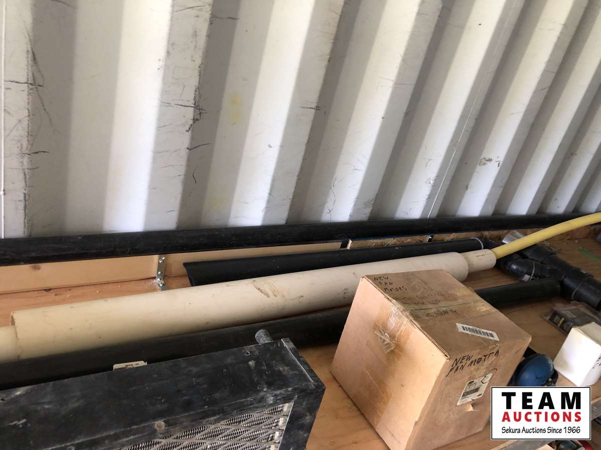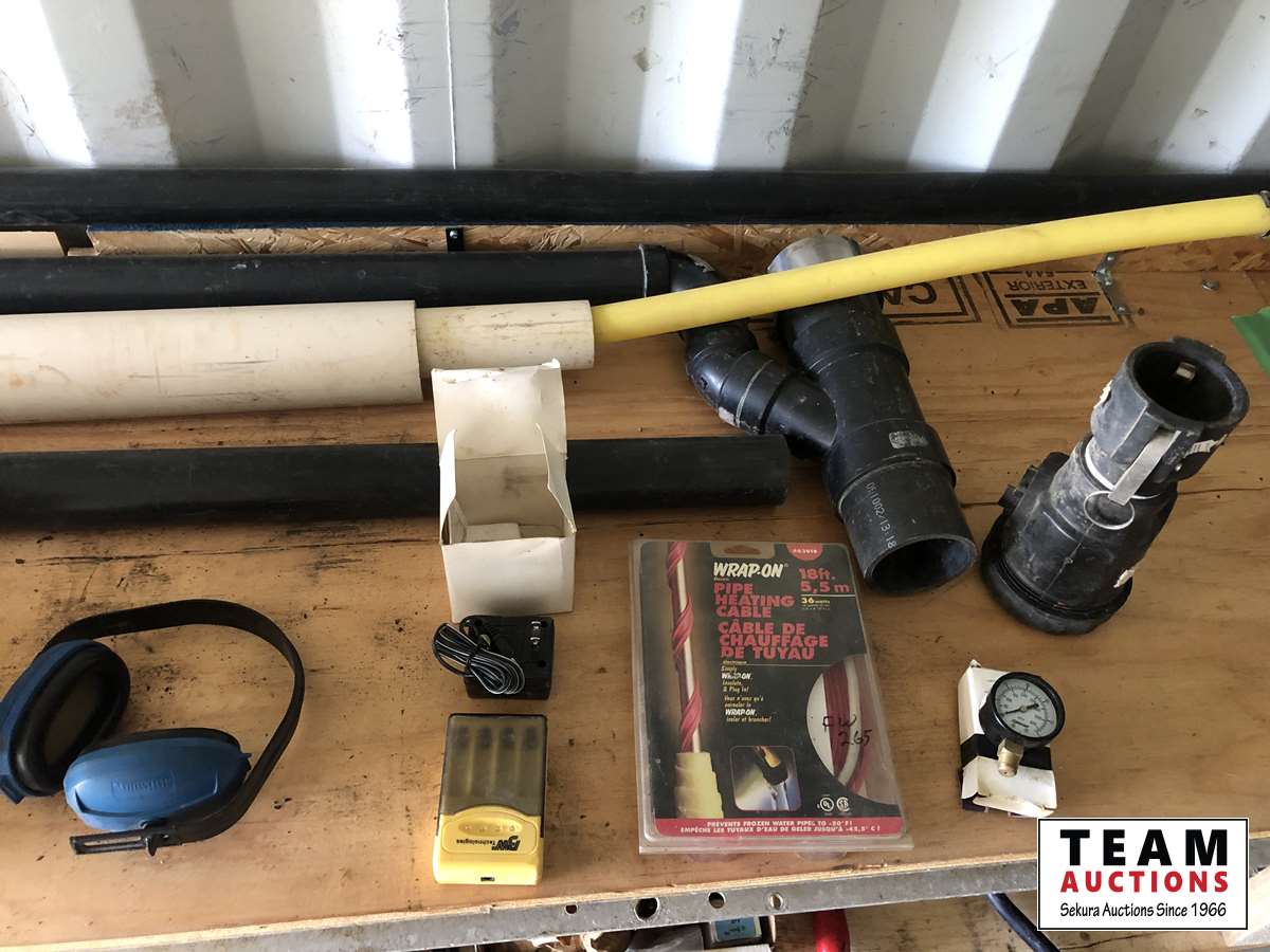 PVC pipe and miscellaneous fittings, heat trace, metal box, new fan motor, cam lock fittings, battery charger, ear muffs, air tank gauge