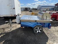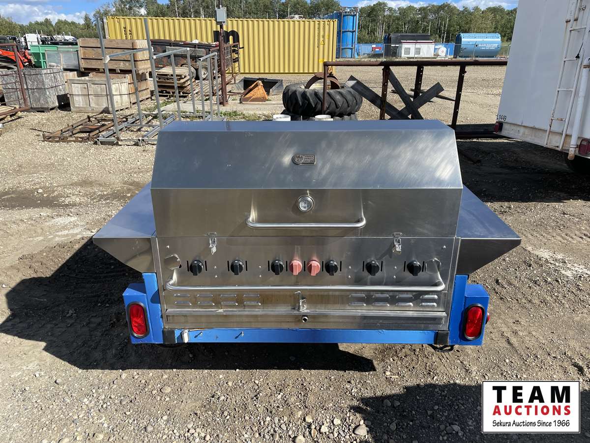 Crown Verity 6 burner propane BBQ, (2) 30 lb propane bottles, (2) storage cabinets, tote of cleaning supplies & BBQ utensils, 185/70 R13 tires