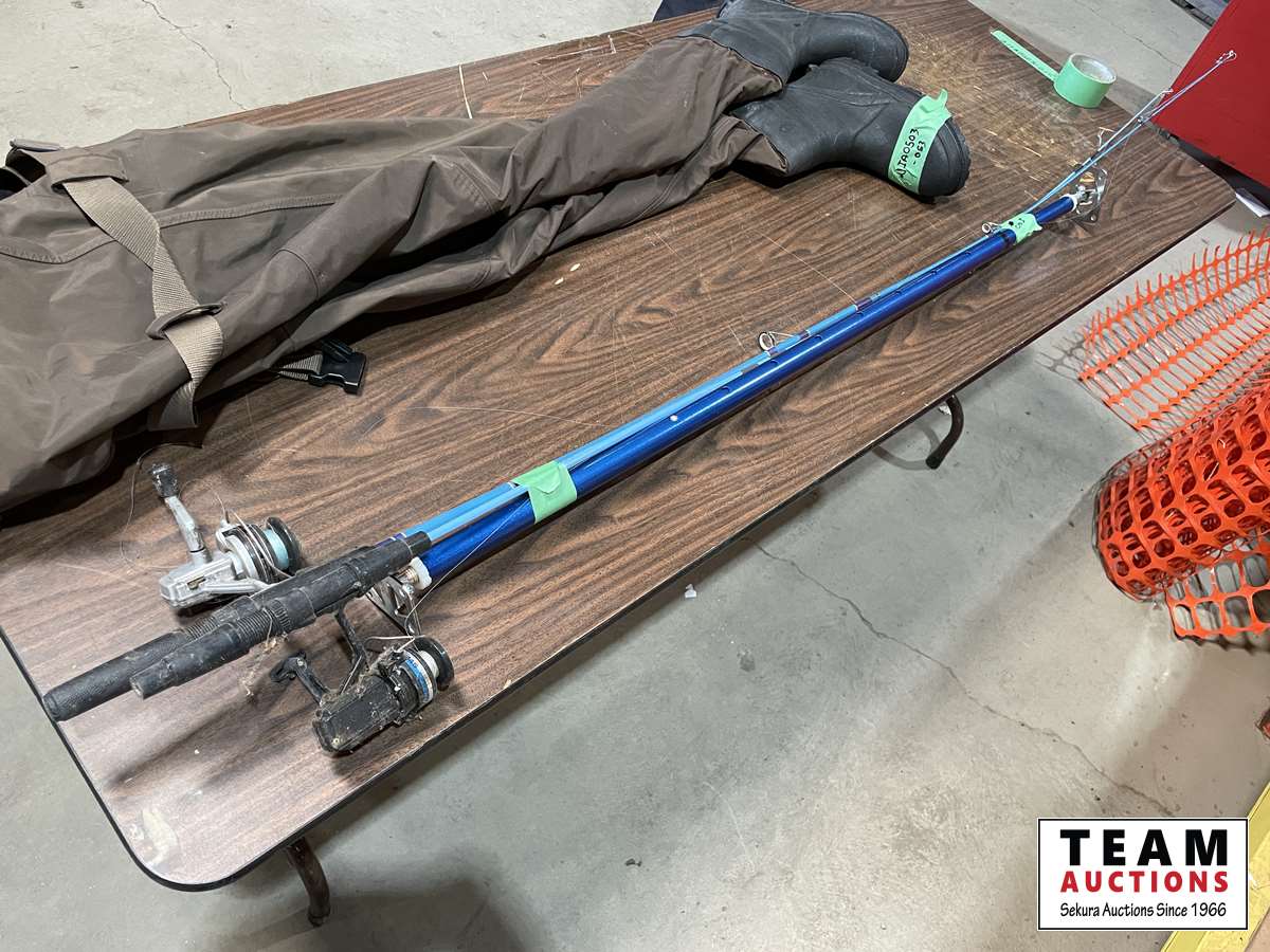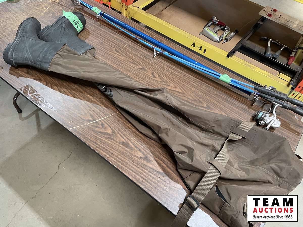 1127 Hip Waders, Fishing Rods and Adjustable Pole