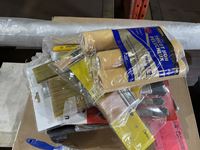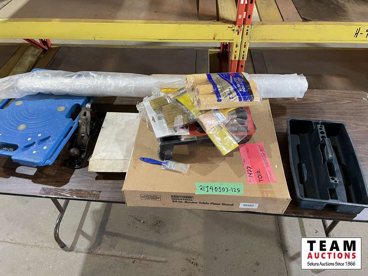 Painting supplies, 24 ft router table floor stand, antique tape measure & planer, dolly, part roll of poly