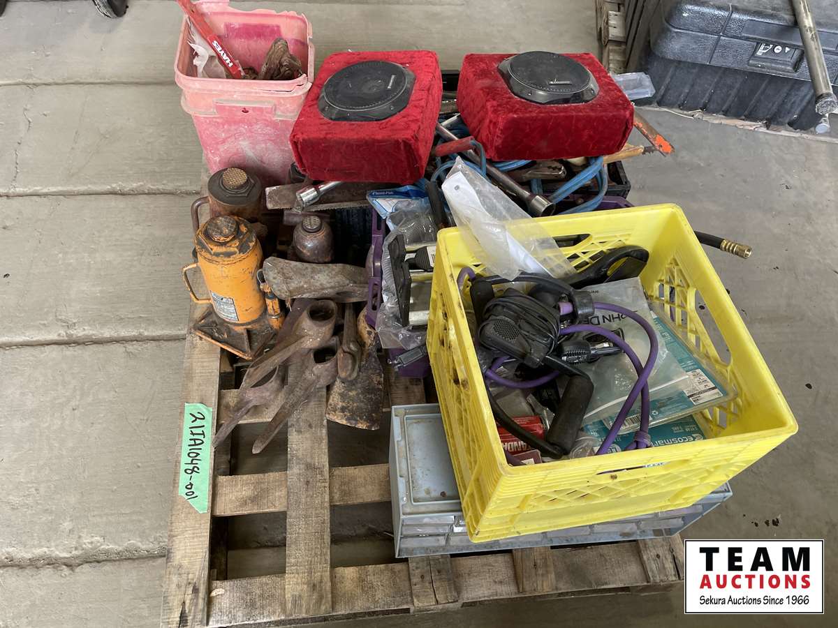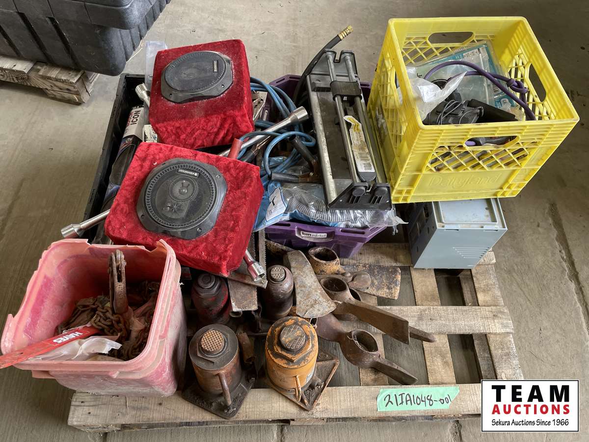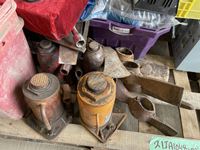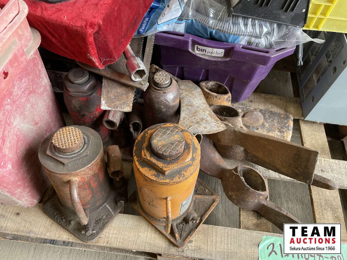 Bottle jacks, 13" tile cutter, pick axe heads, foot box of pins
