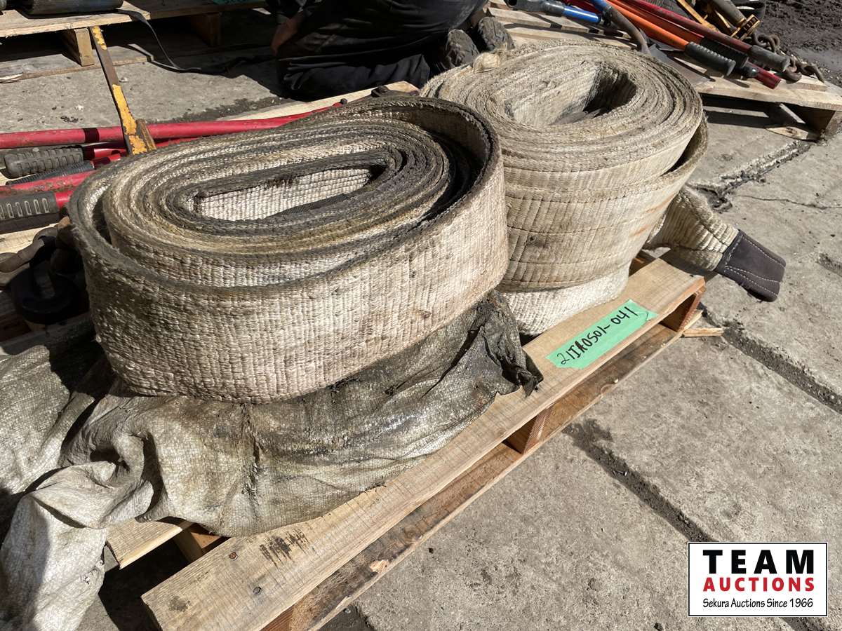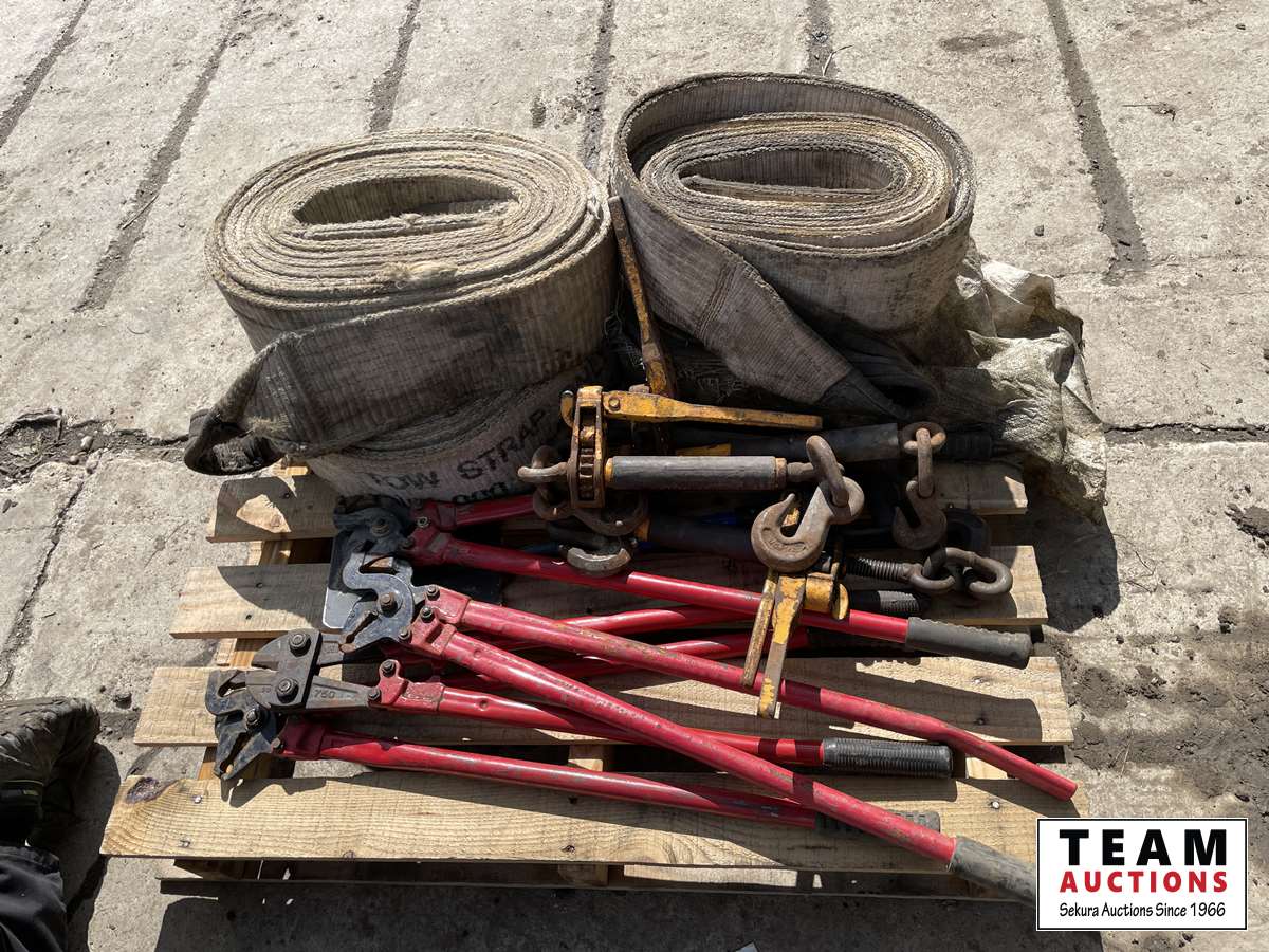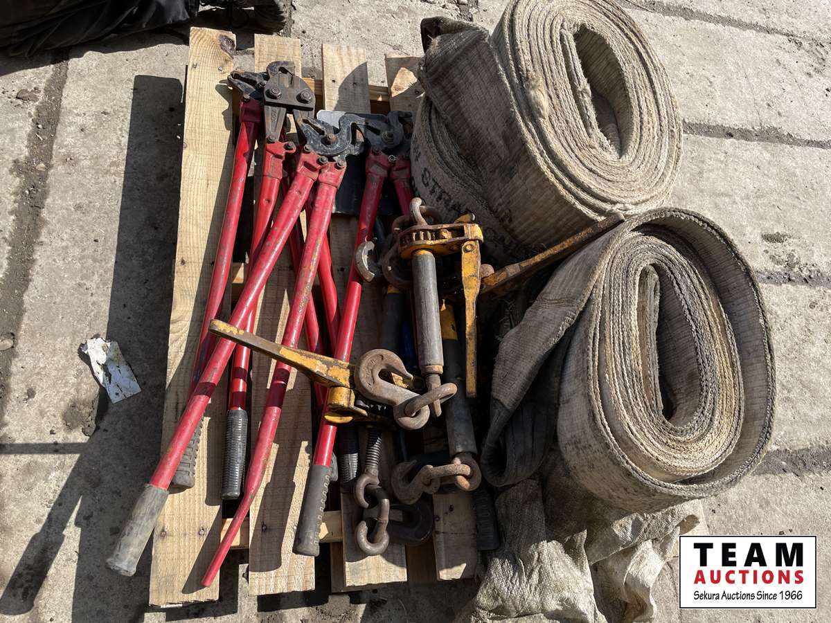 (4) load binders, (4) slings, small shovel, (3) truck chain plies, bolt cutter