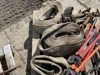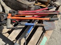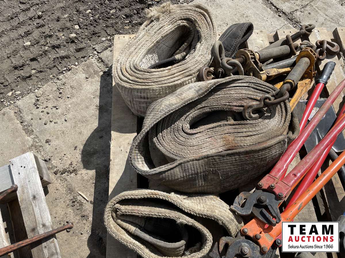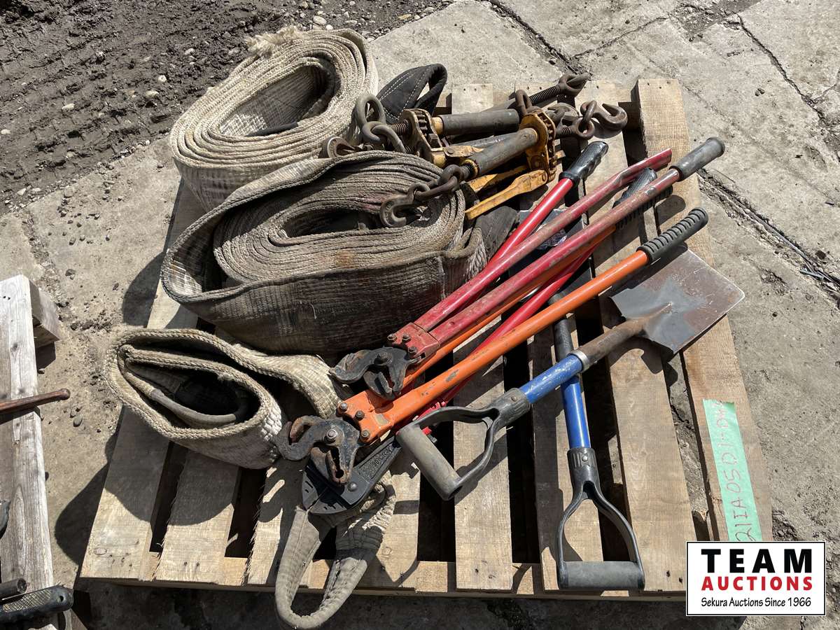 (3) slings, (2) truck chain pliers, (2) small shovels, bolt cutter, (4) load binders