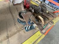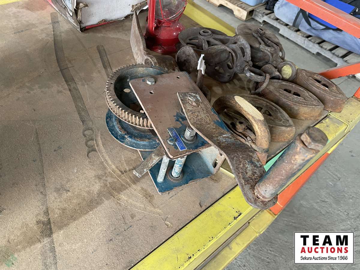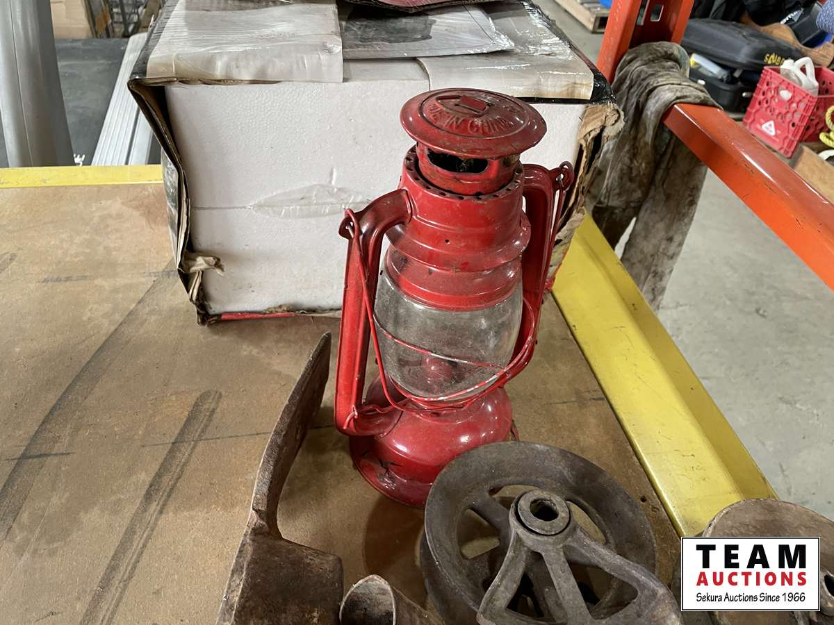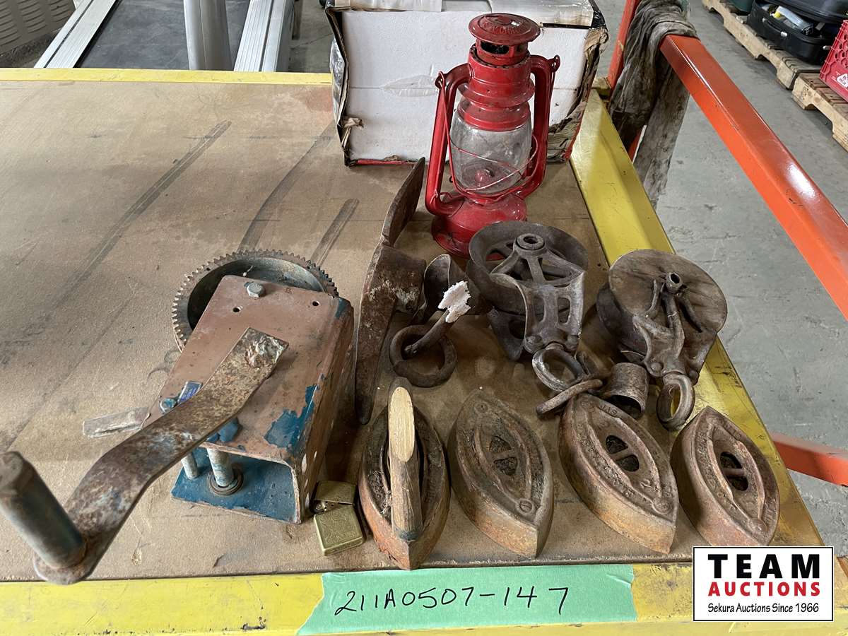 Irons, lanterns, pulleys, pick axe head, winch
