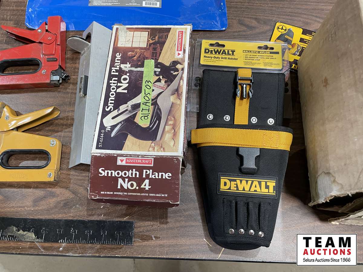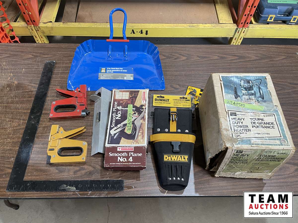 Square, hand planer, router, dust pan, level, etc.