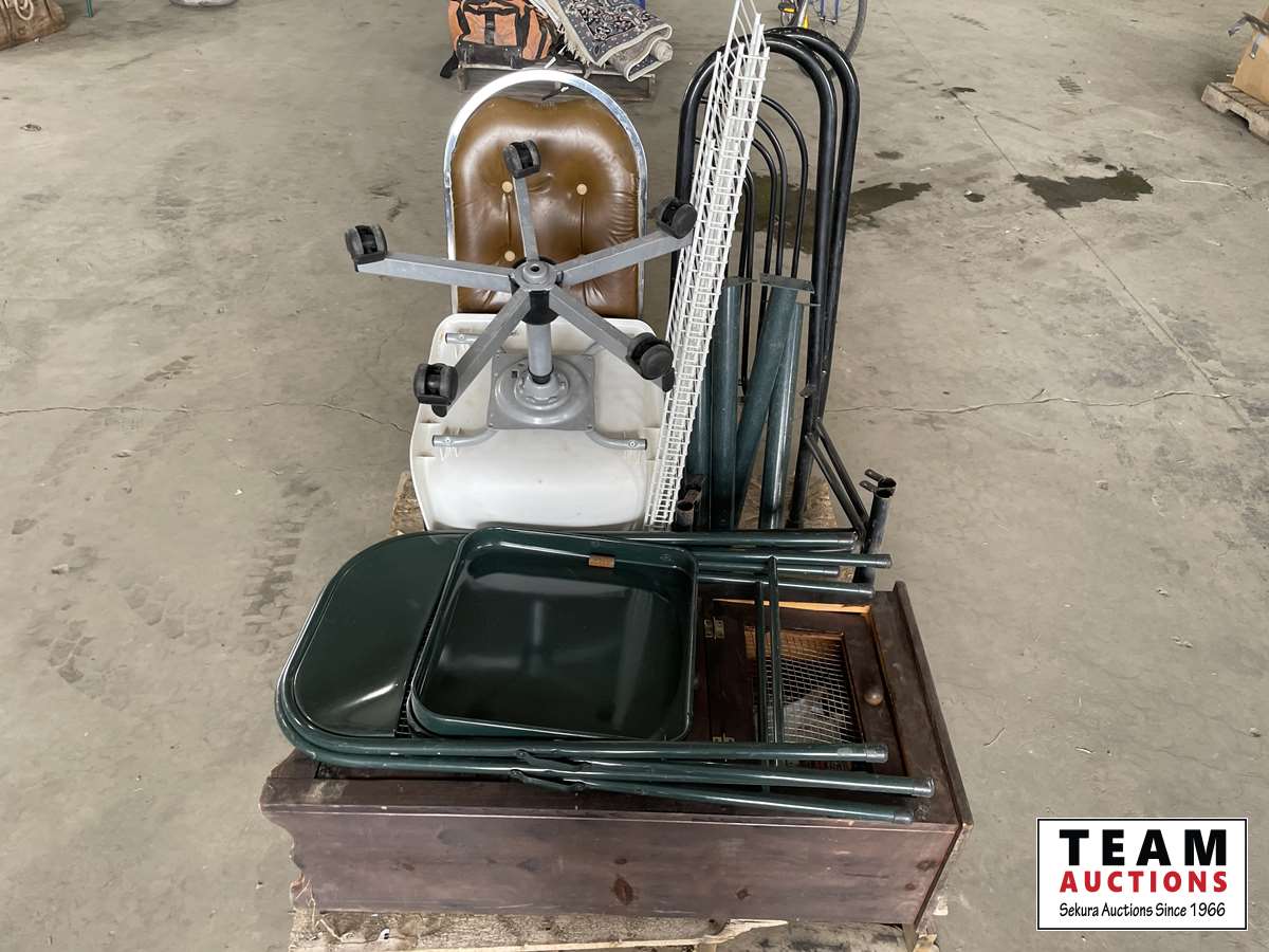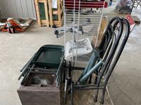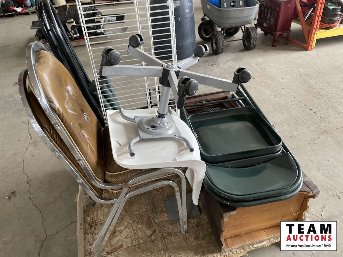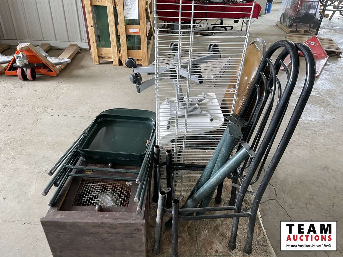 Chairs, wooden cabinet, wire shelves