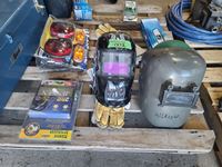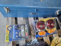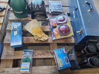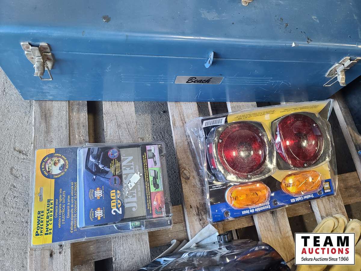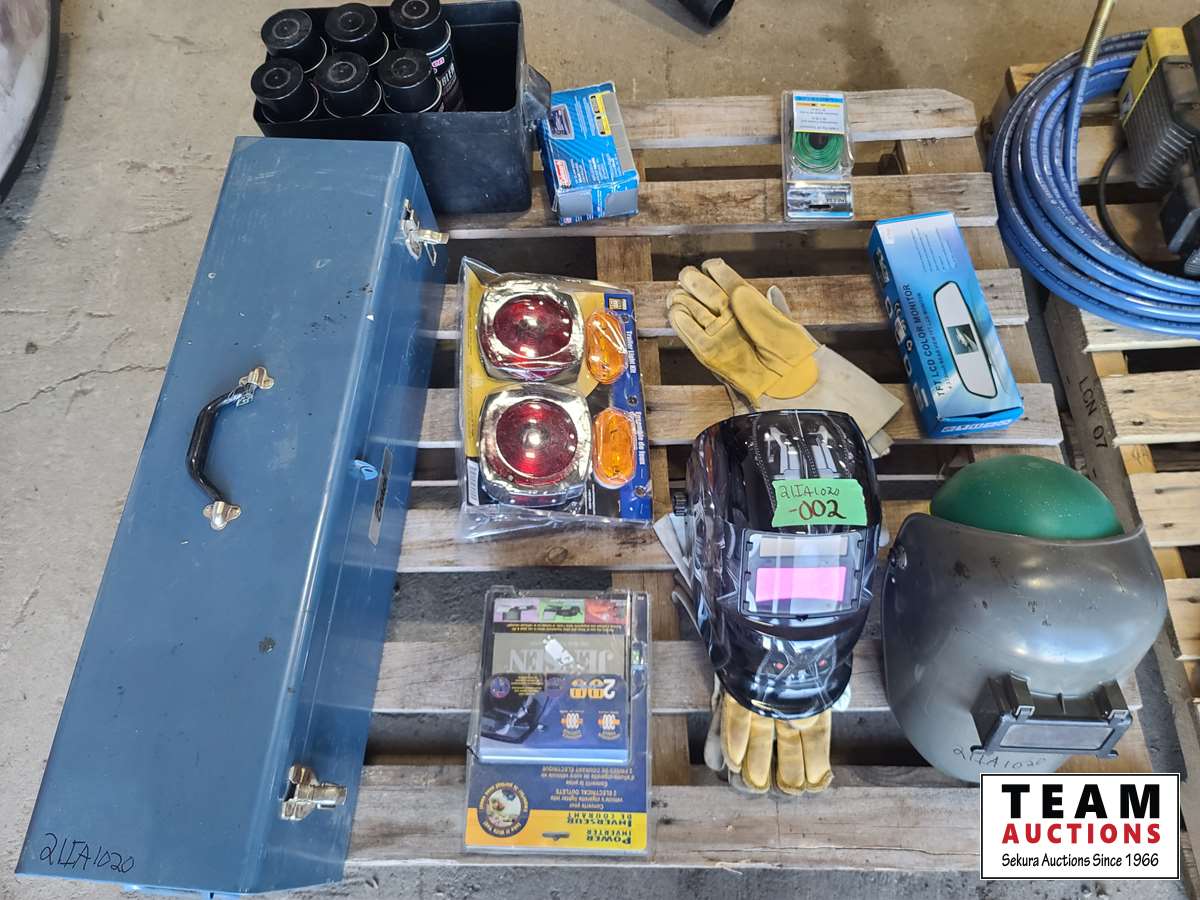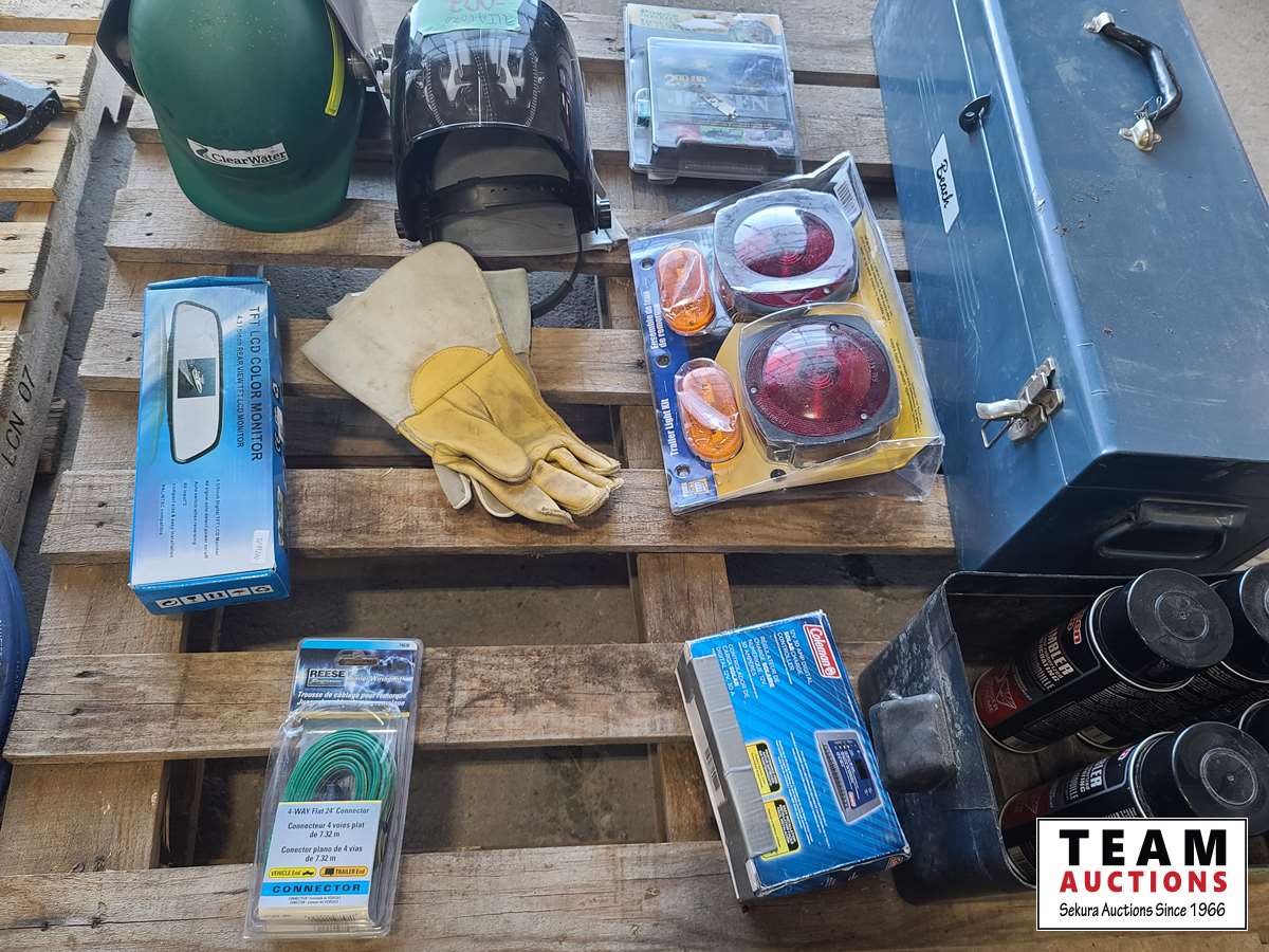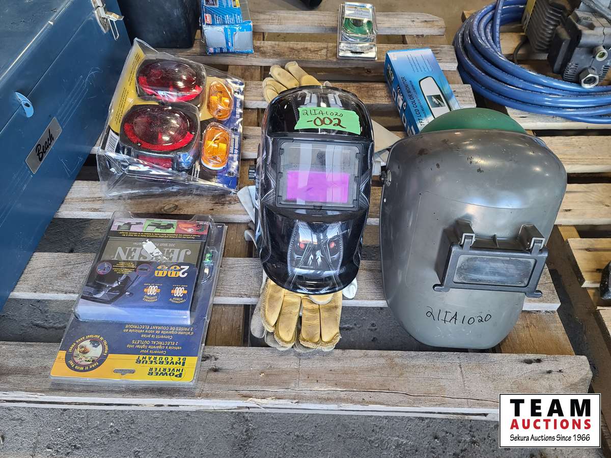 Welding helmets, trailer lights, tool box, (6) cans rubber coating, small inverter, LCD mirror, wiring kit, Solar charger
