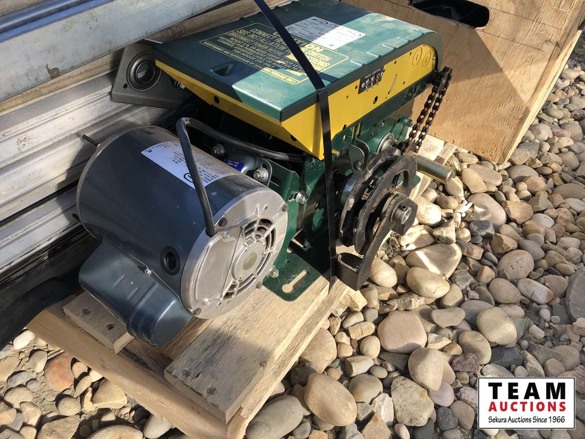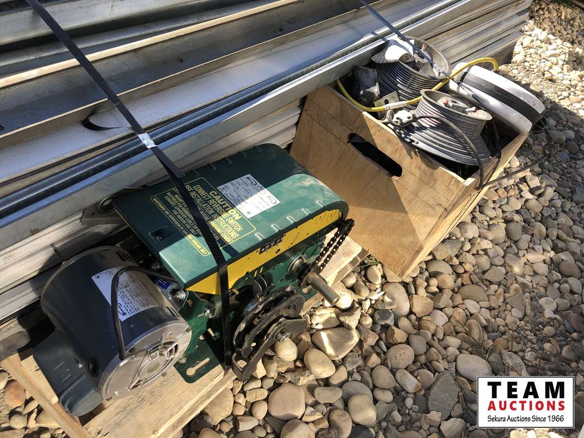 (8) panels, (3) springs, (1) motor 3/4 HP single phase 12 amp 60 hz 115V, box of hardware, rail system