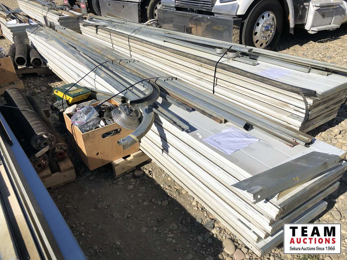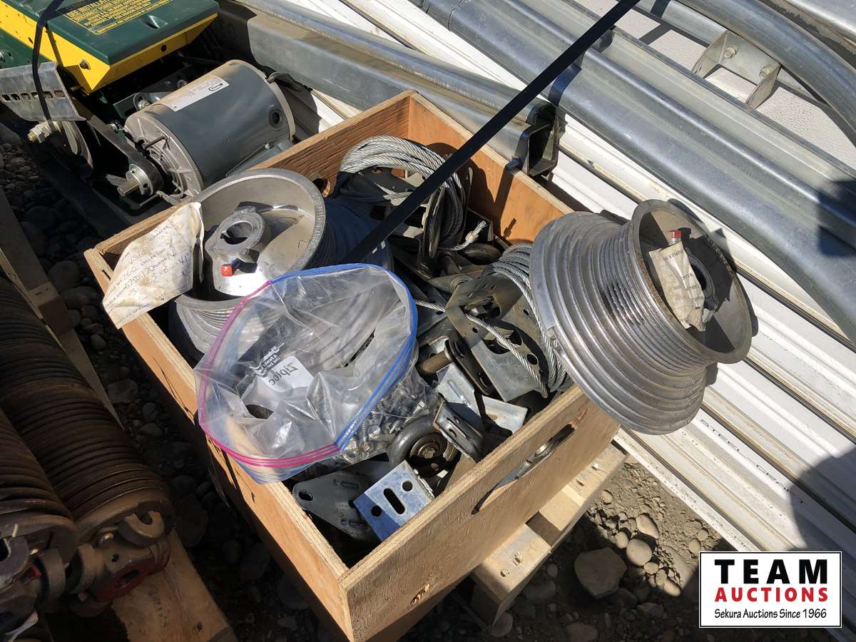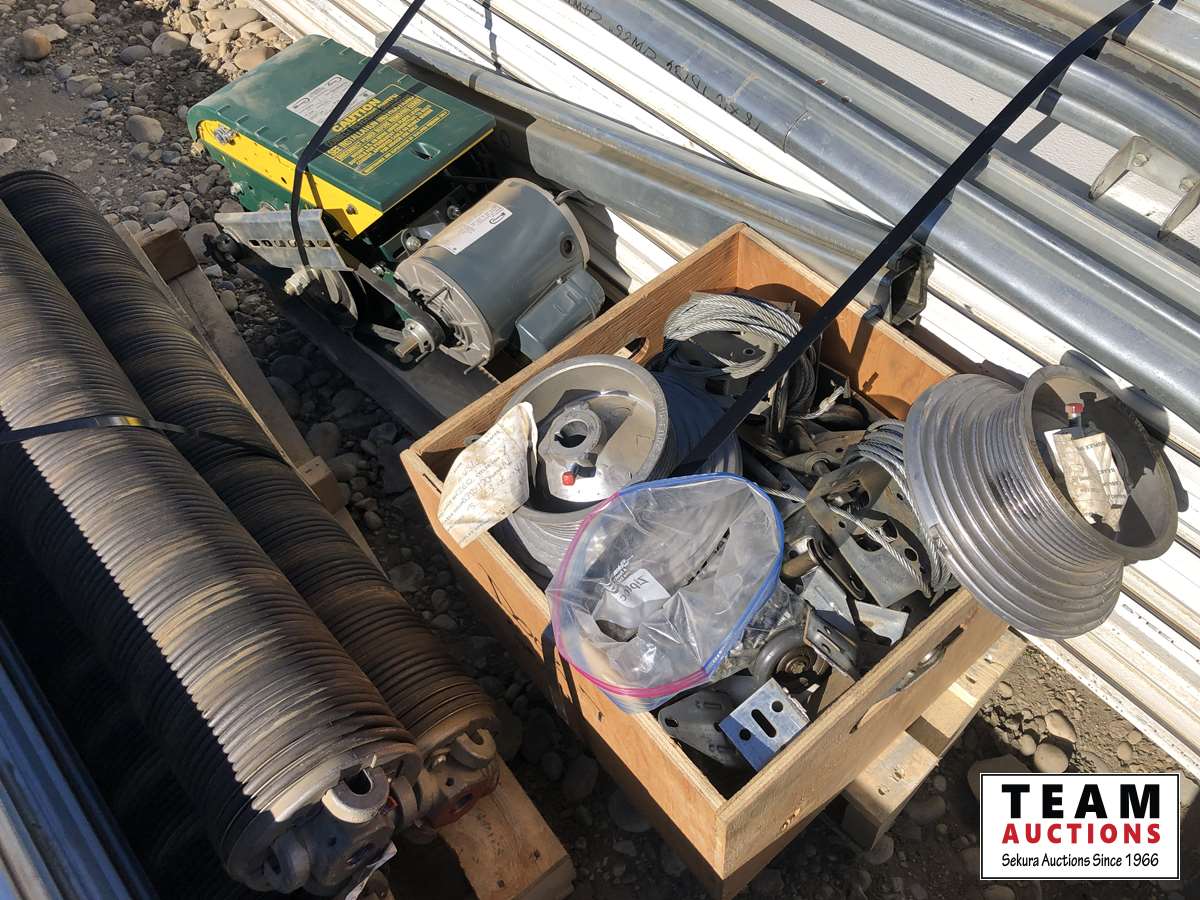 (8) panels, (3) springs, (1) motor 3/4 HP single phase 12 amp 60 hz 115V, box of hardware, rail system