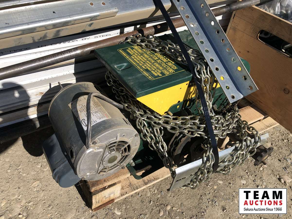 (8) panels, (3) springs, (1) motor 3/4 HP single phase 12 amp 60 hz 115V, box of hardware, rail system