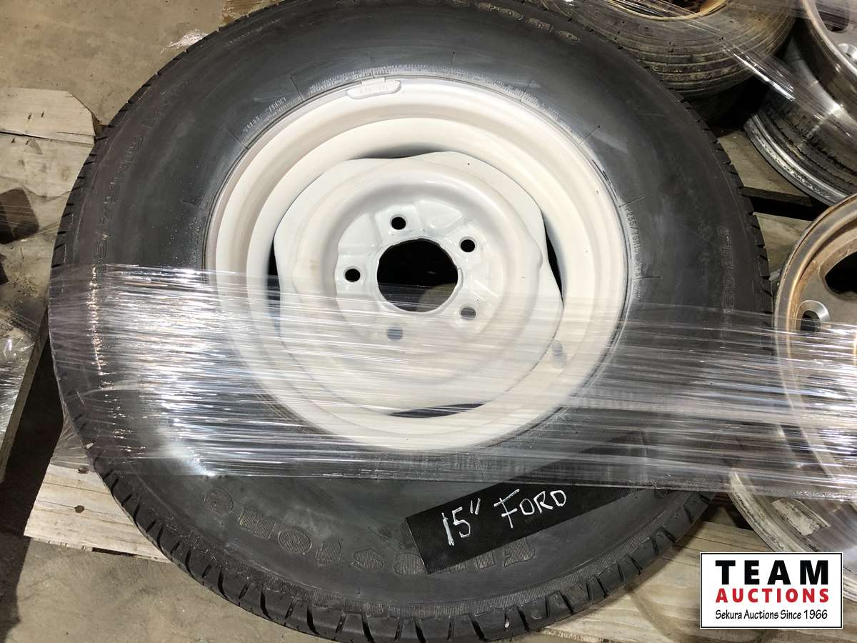 1416 (2) 17 Inch Chev Rims, (1) 15 Inch Ford Tire and Rim, (2) Wheel Barrow Tires