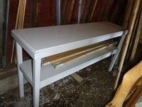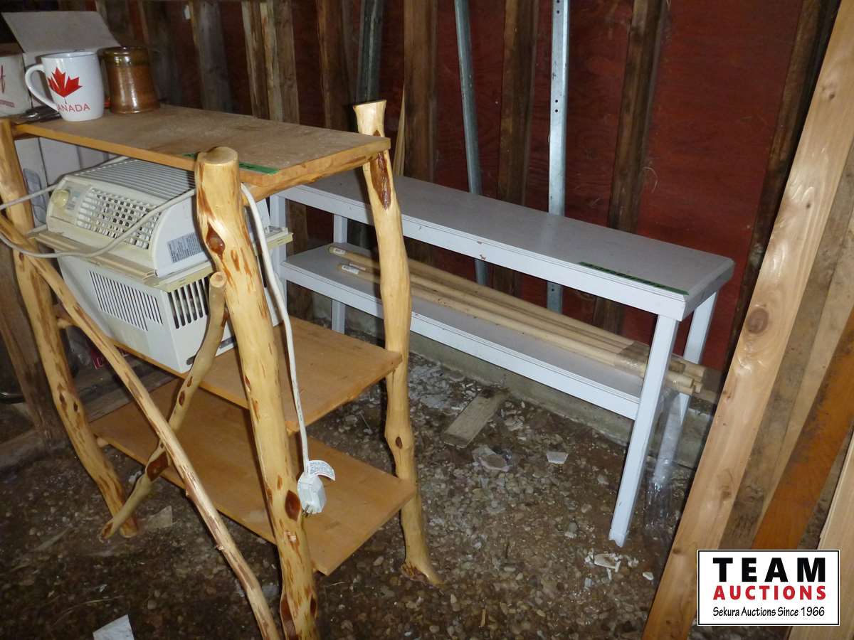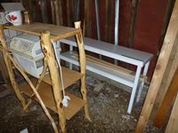(1) 3 shelf willow unit, (1) Wood 15 inch W X 57 inch L X 29 inch H shelf unit