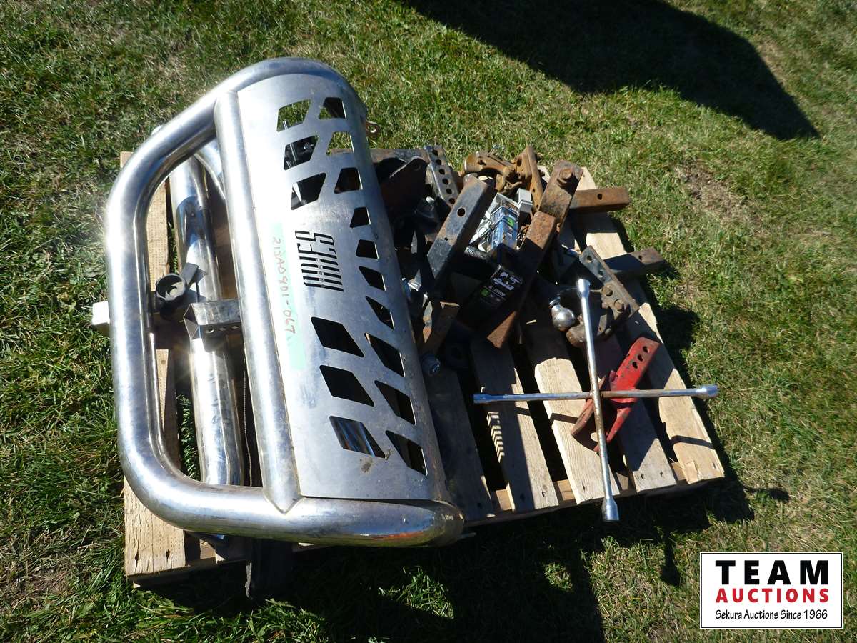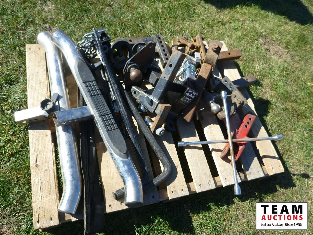 Front truck bumper, (8) various 2 inch Receiver hitches, pintle hitch, (2) receiver steps