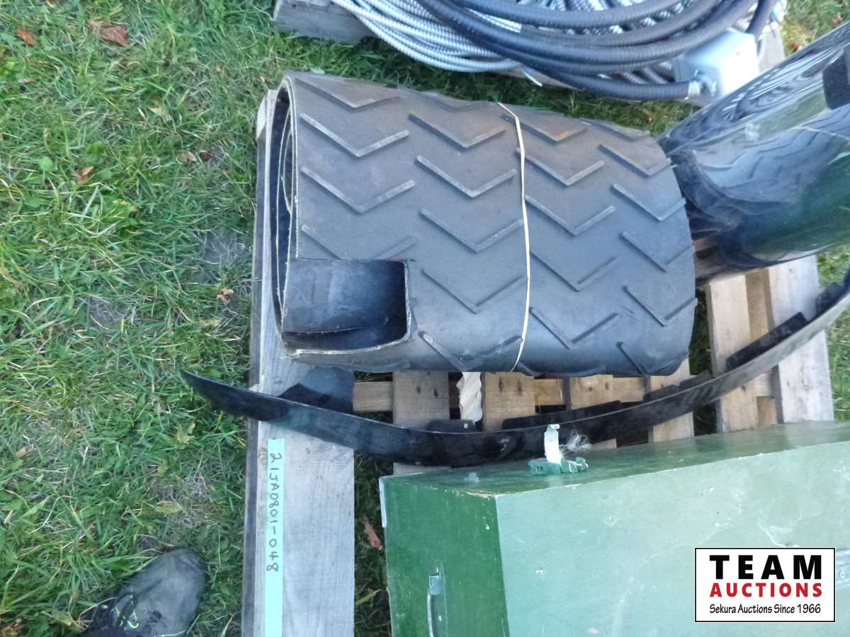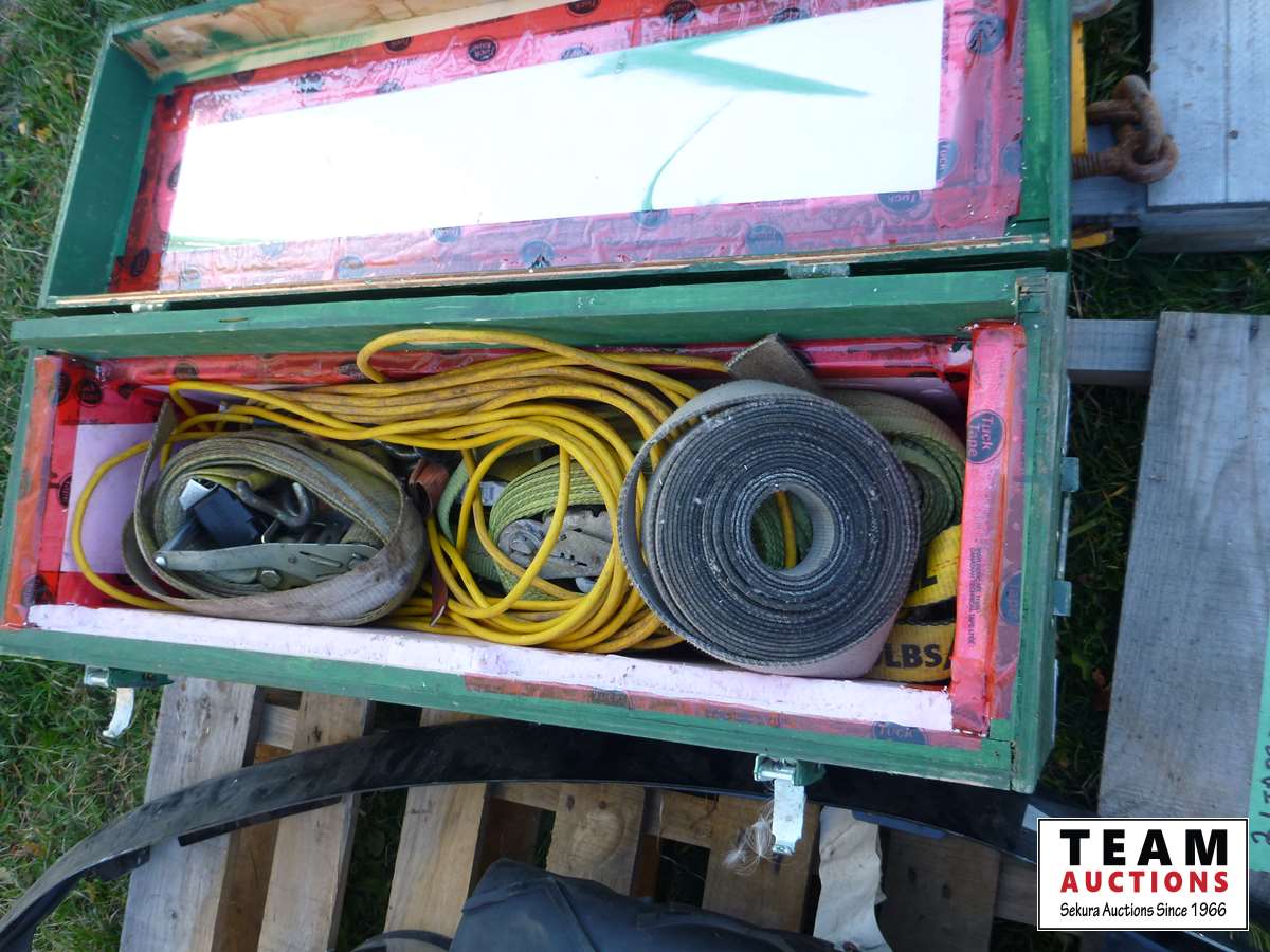 Rubber belting, box with ratchet straps and cords, garbage can