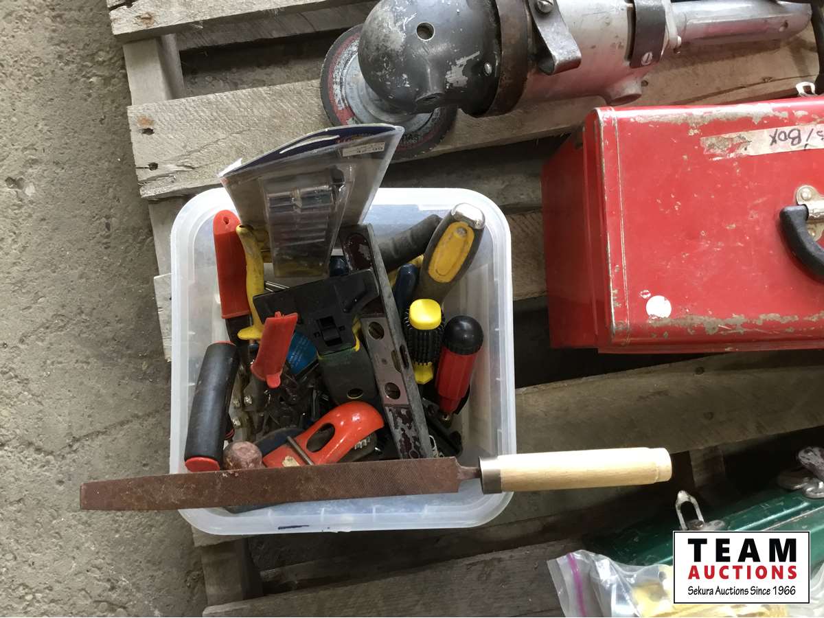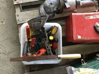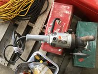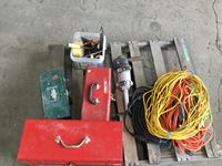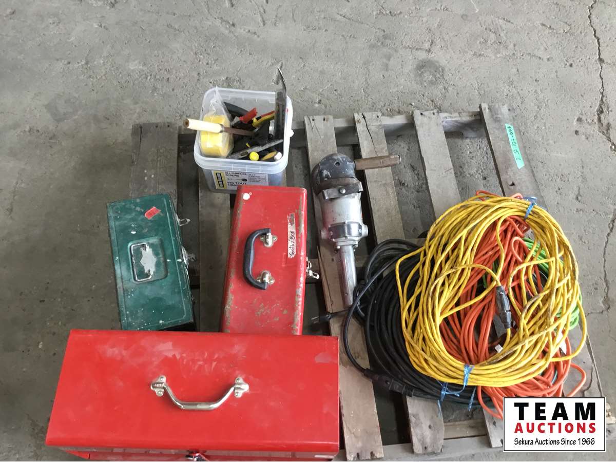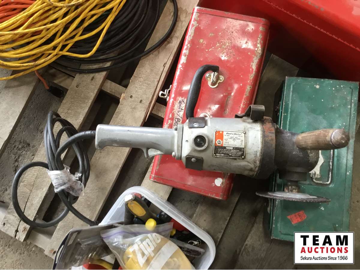 (3) tools boxes, 7 inch Black & Decker angle grinder, miscellaneous tools, (2) 100 ft extension cords, (5) ft Extension cords