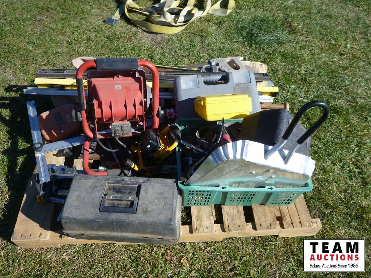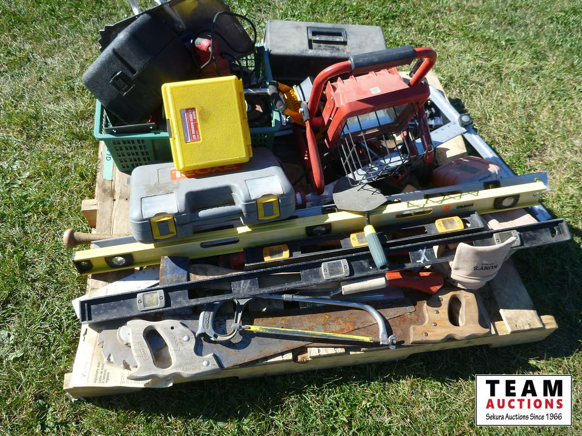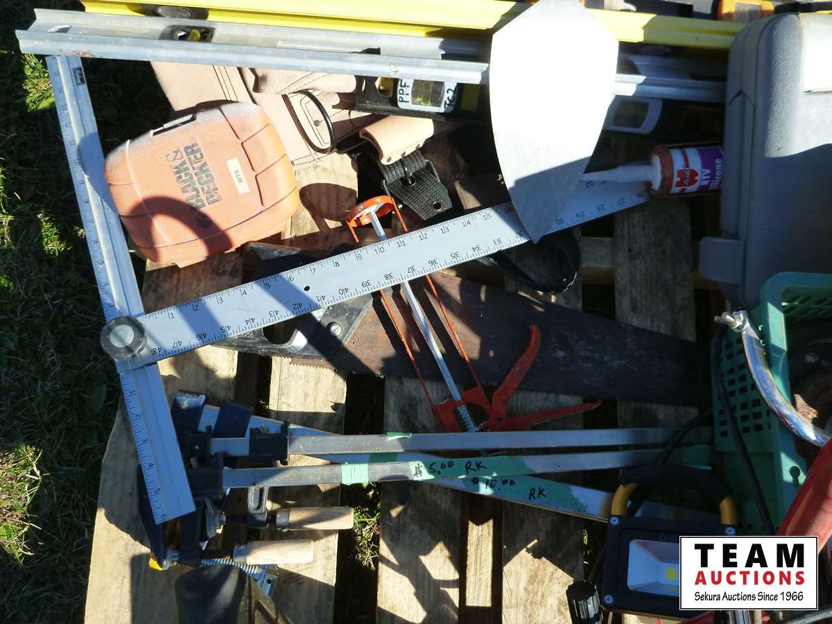 Levels, saws, soldering kit, work lights, tool belt, grinding discs, clamps, plus miscellaneous items