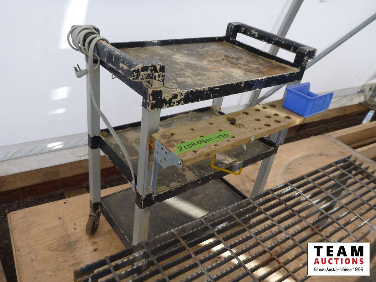 Rubber mat, (2) chrome box rails, (2) masonry mesh, shop cart & metal stand