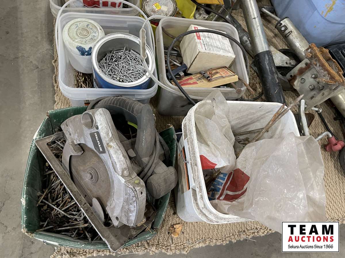 Nails, screws, work lights, trailer jacks, battery booster, chainsaw chains