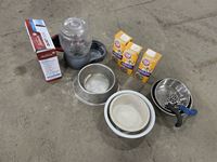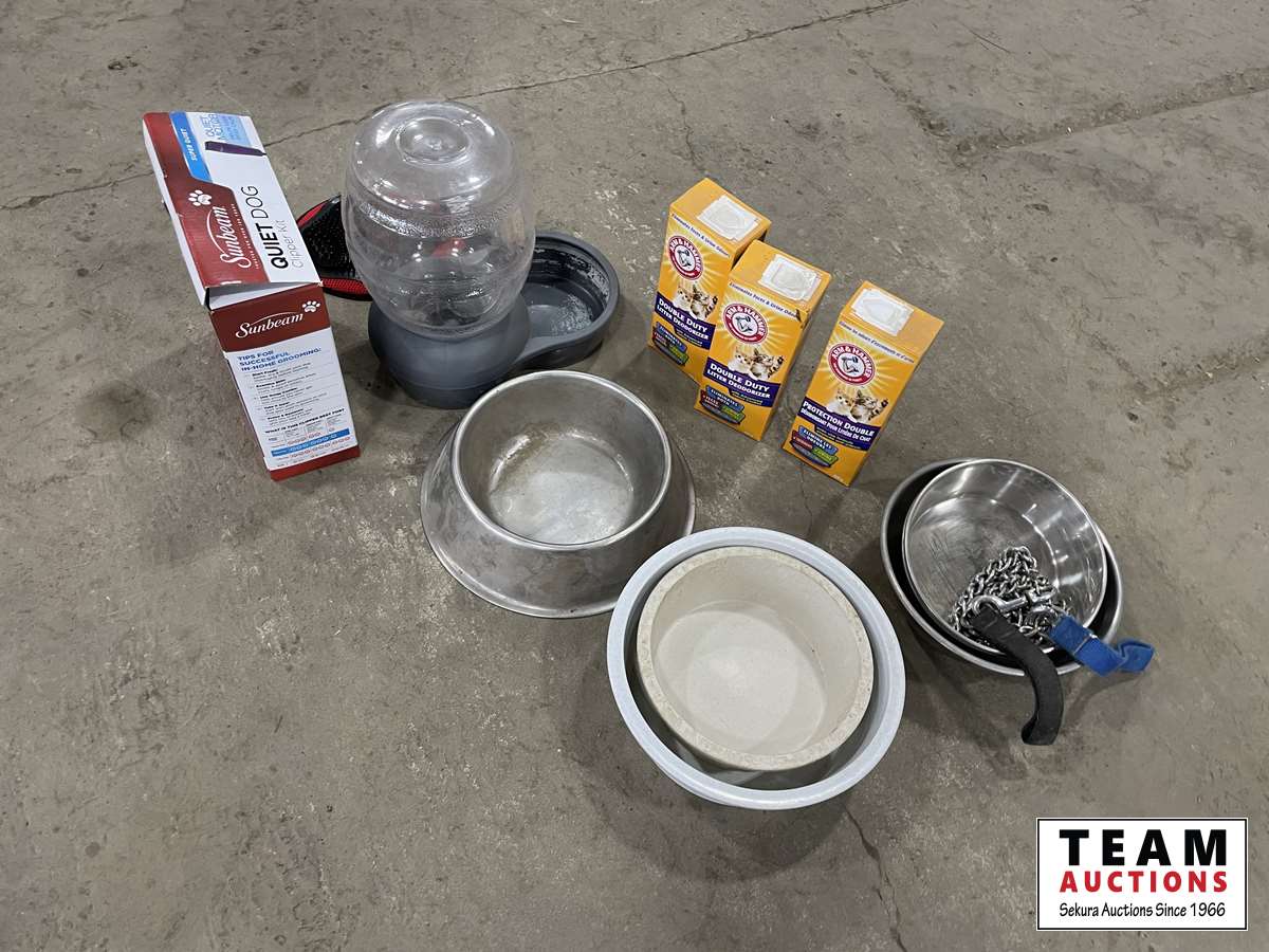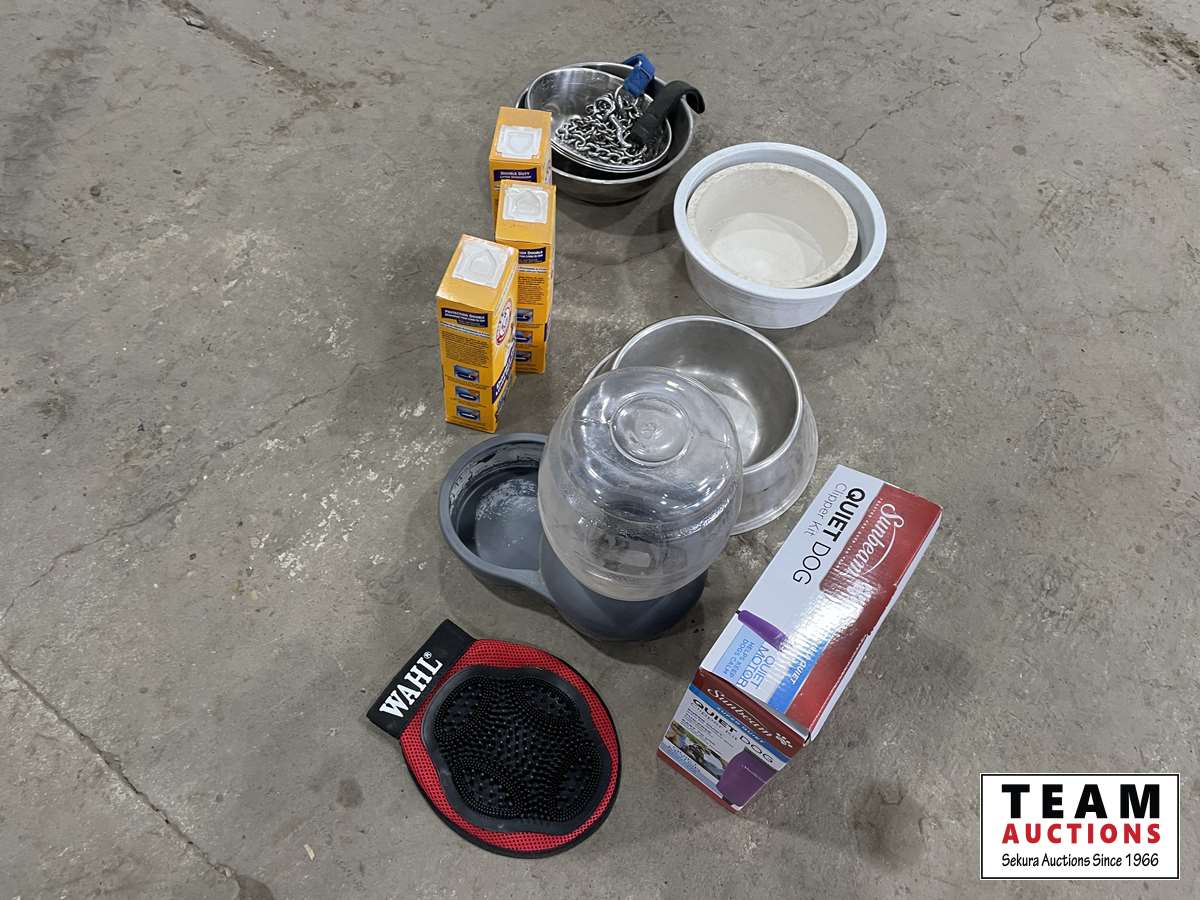 Food bowels, water dispenser, Arm & Hammer litter deodorizer, clippers