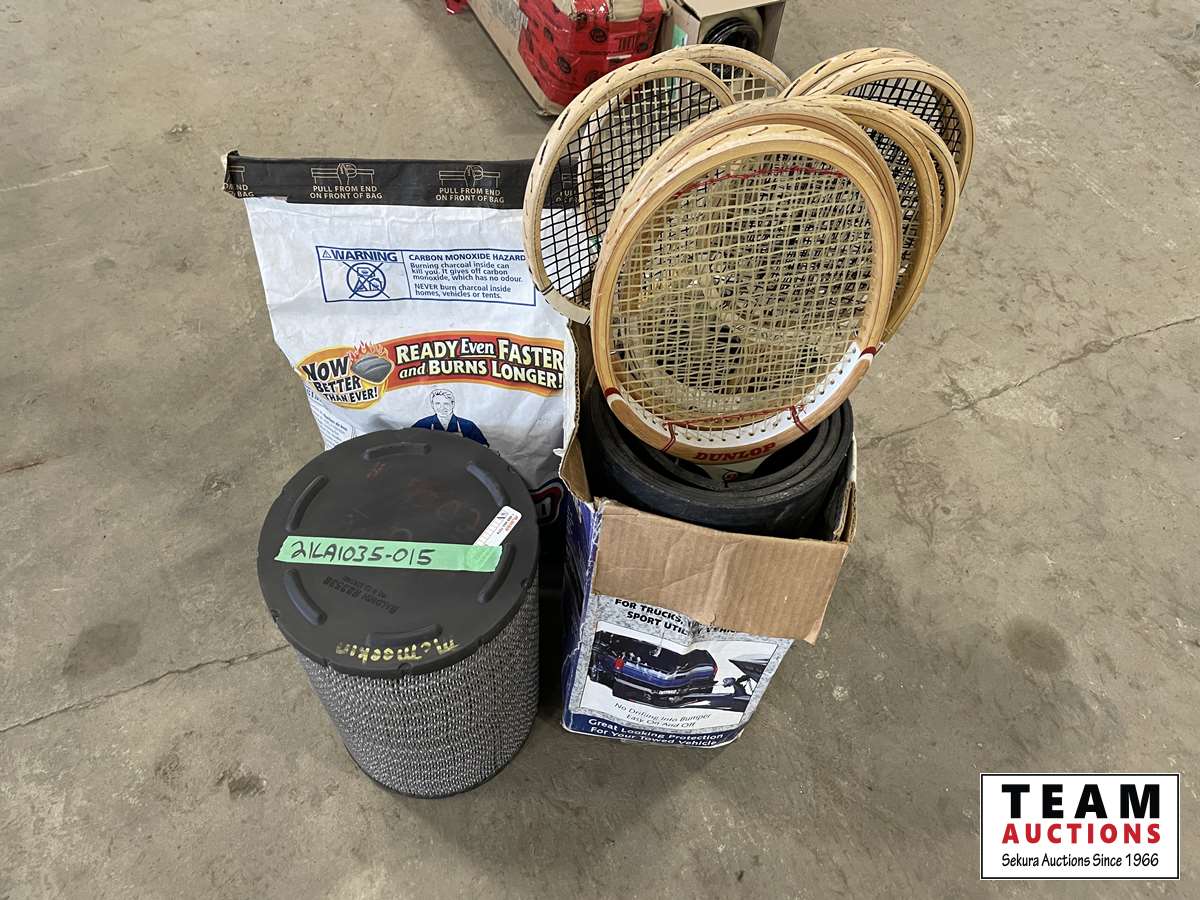 1496 Tennis Racket, Bag of Charcoal Briquets, Air Filter