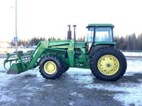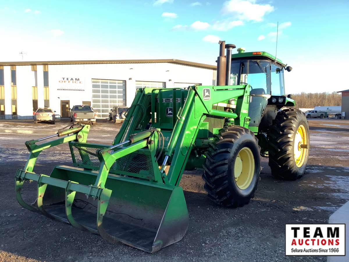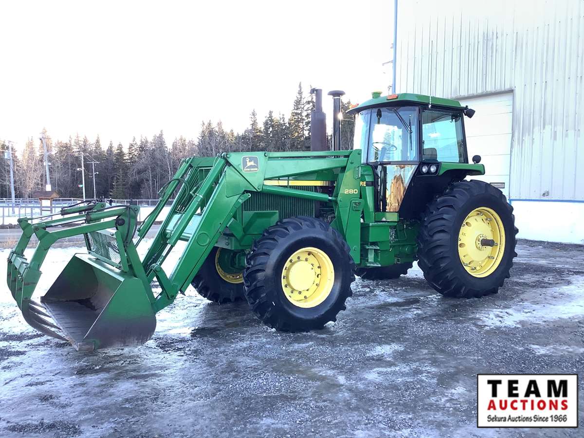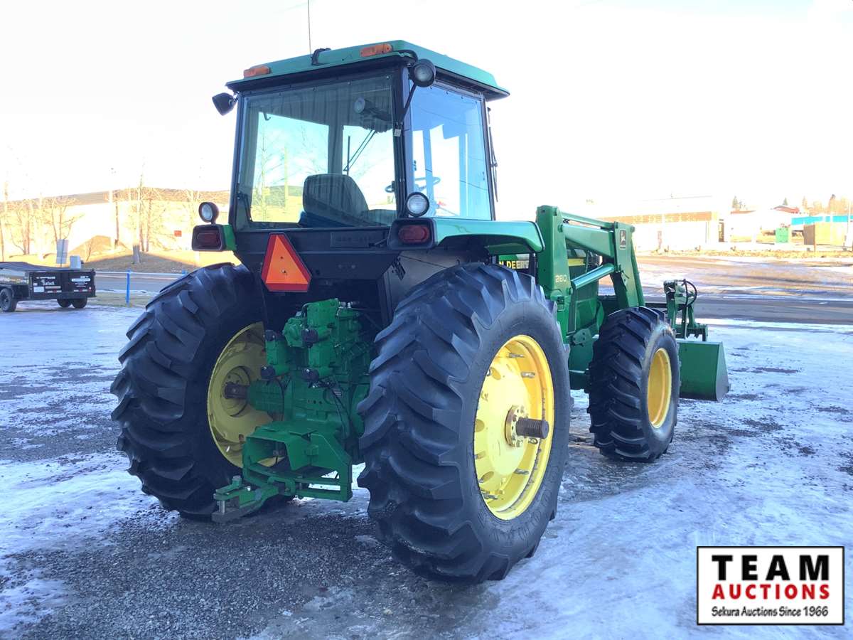 JD 280 loader, Q/A bucket with grapple fork, grill guard, 15 speed power shift transmission, cab, heat, radio, AC, hydraulic ride seat, (3) rear hydraulic outlets, 1000 PTO, Star Fire 3000 green light bar system, rear diff lock, rear inside wheel weights, 18.4 x 26 front (new) & 20.8 x 38 rear tires, 11,918 hours