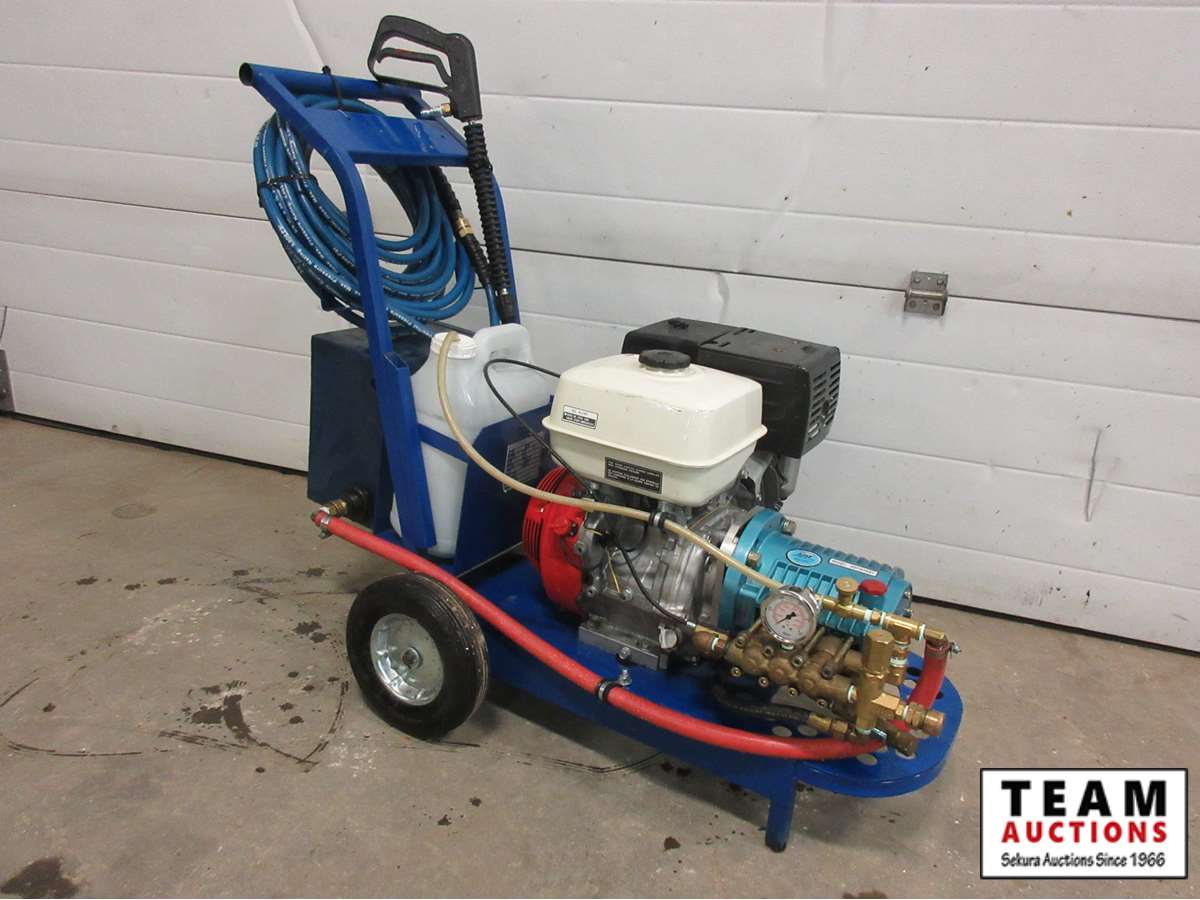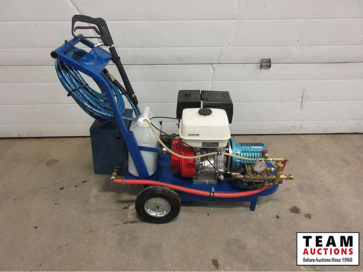 Honda GX340 gas engine, Cat 4SF40 pump, 3000 psi max pressure, 3/8 X 50' hose, wand, (4) nozzles, water reservoir with float and garden hose connection, soap injection system, auto idle on engine when trigger is released
