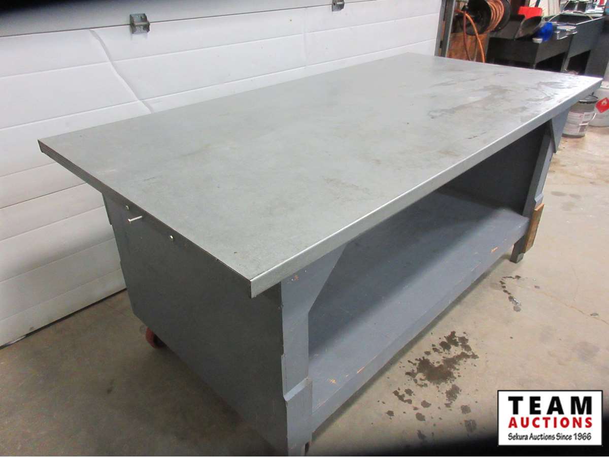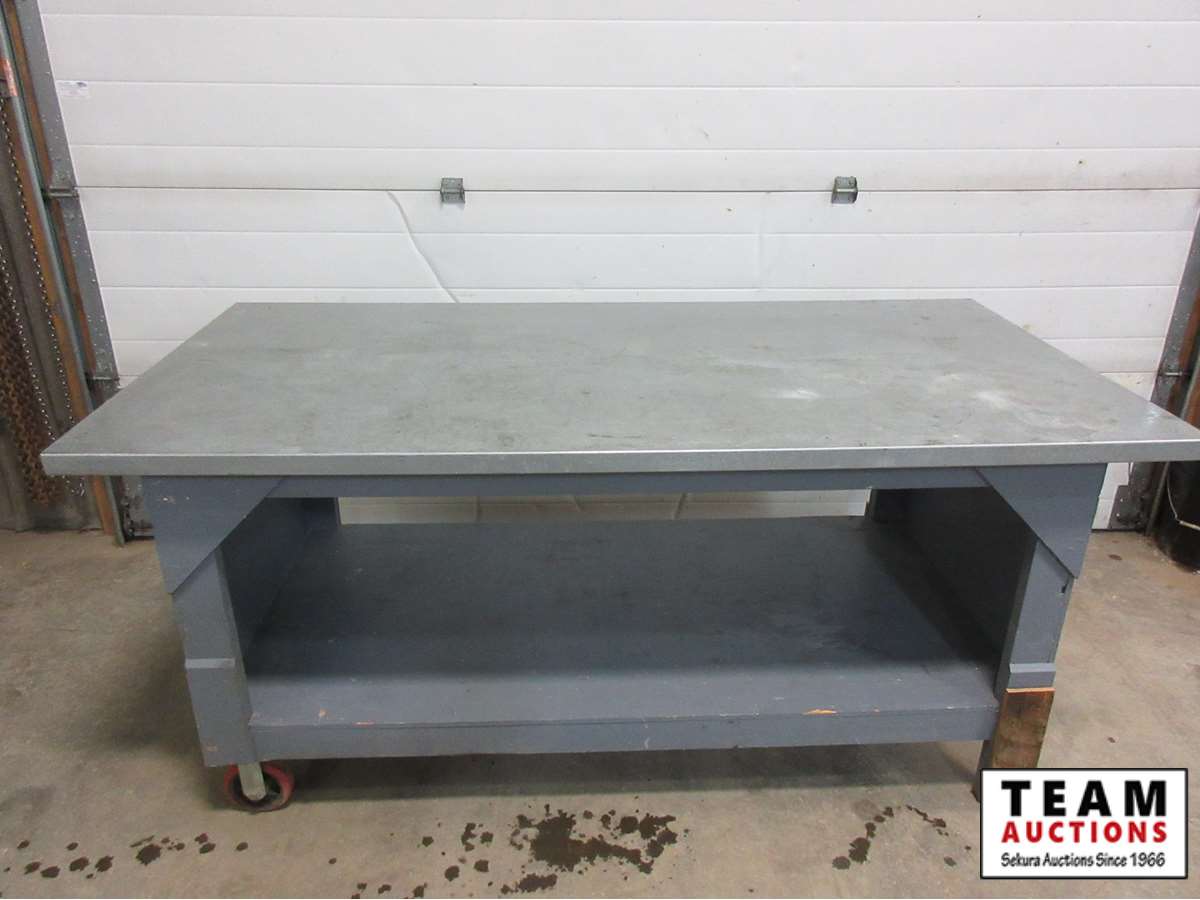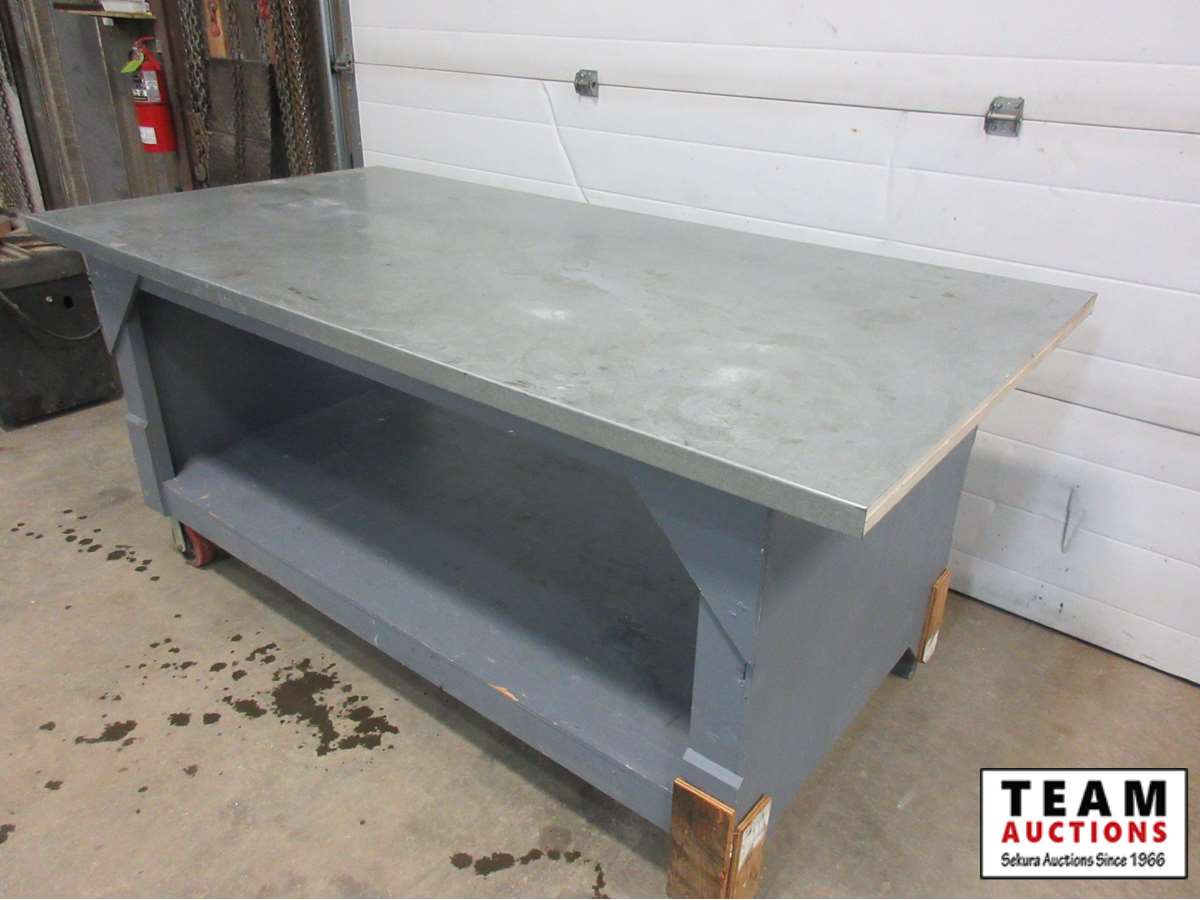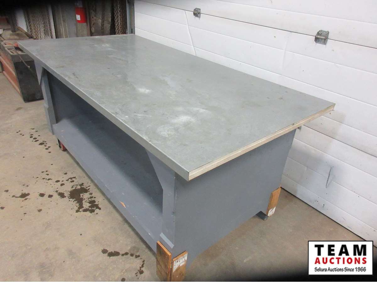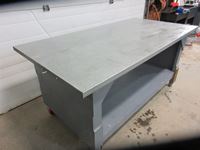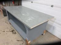 42" wide X 84" long X 38" high, formed galvanized top, wheels on one end