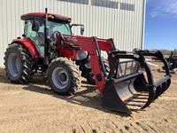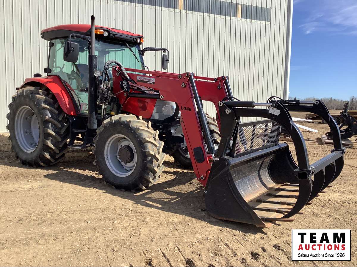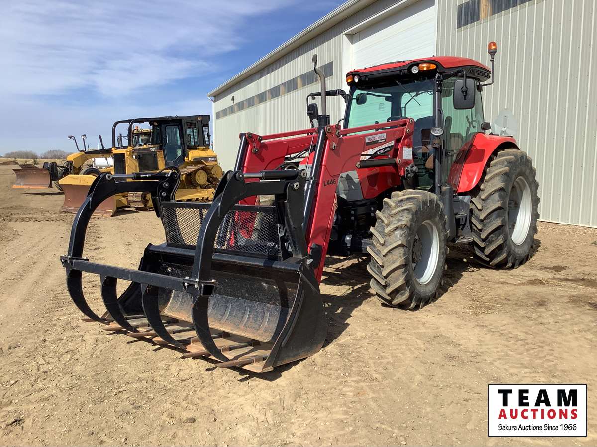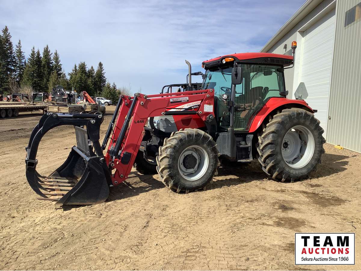 L446 loader, Q/A bucket, grapple, bucket tines, joystick, Perkins engine, cab, 2 doors, A/C, heat, radio, buddy seat, sun roof, 36 F & 12R transmission with left hand reverser, 3 pt hitch, 540/1000 PTO,3 rear hydraulic couplers, radial 14.9 x 24 front & 18.1 x 34 rear tires